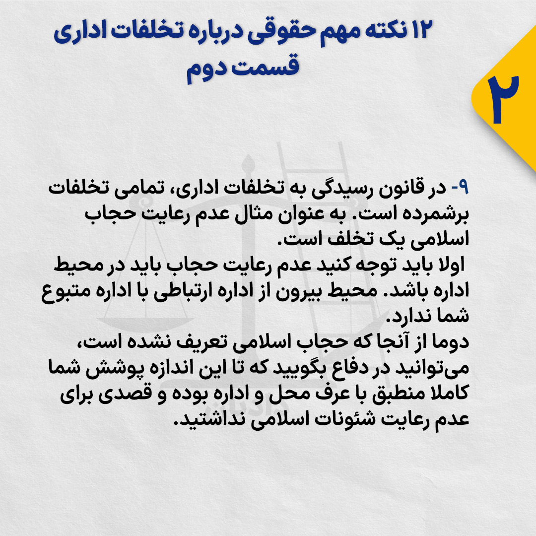 ۹- در قانون رسیدگی به تخلفات اداری، تمامی تخلفات برشمرده است. به عنوان مثال عدم رعایت حجاب اسلامی یک تخلف است.