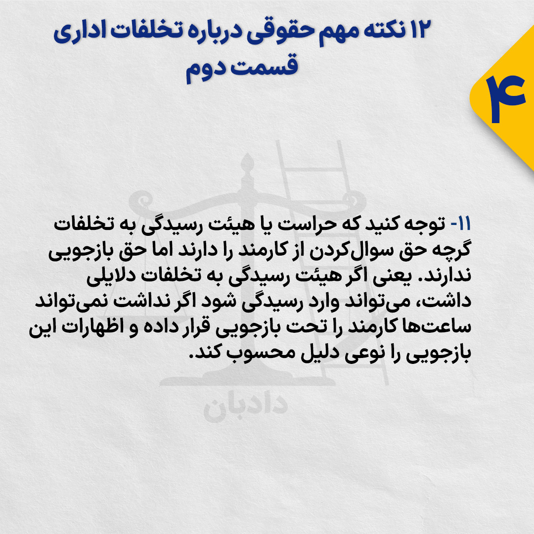 ۱۱- توجه کنید که حراست یا هیئت رسیدگی به تخلفات گرچه حق سوالکردن از کارمند را دارند اما حق بازجویی ندارند. یعنی اگر هیئت رسیدگی به تخلفات دلایلی داشت، میتواند وارد رسیدگی شود اگر نداشت نمیتواند ساعتها کارمند را تحت بازجویی قرار داده و اظهارات این بازجویی را نوعی دلیل محسوب کند.