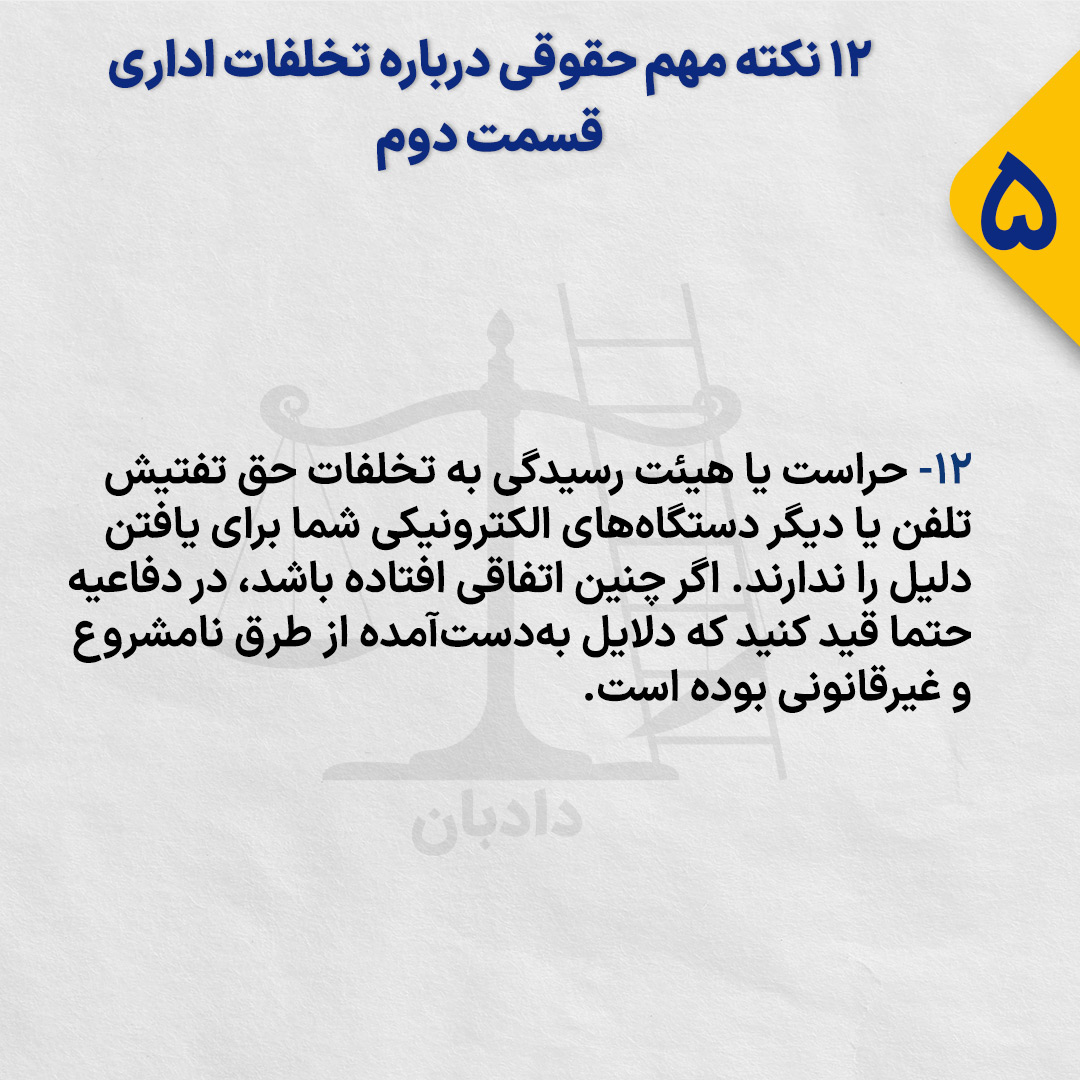 ۱۲- حراست یا هیئت رسیدگی به تخلفات حق تفتیش تلفن یا دیگر دستگاههای الکترونیکی شما برای یافتن دلیل را ندارند. اگر چنین اتفاقی افتاده باشد، در دفاعیه حتما قید کنید که دلایل بهدستآمده از طرق نامشروع و غیرقانونی بوده است.
