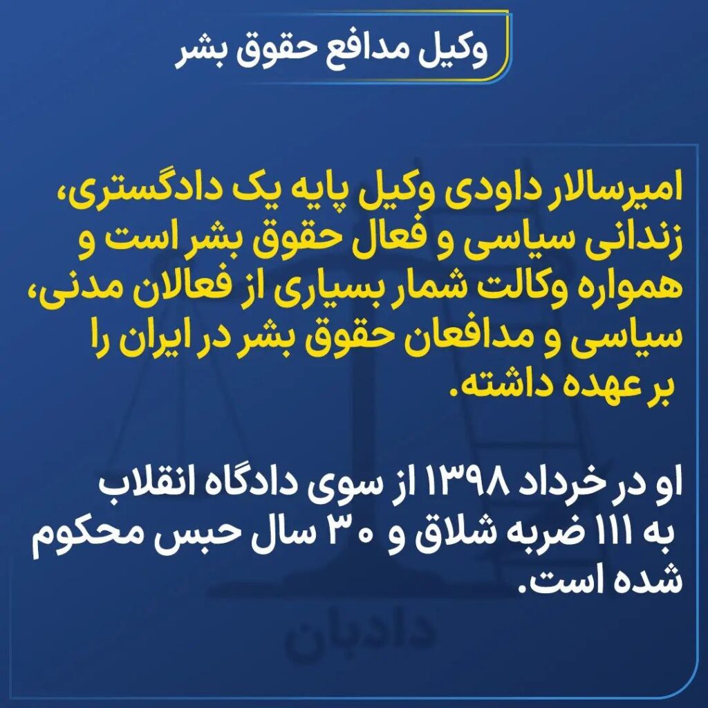 امیرسالار داودی وکیل پایه یک دادگستری، زندانی سیاسی و فعال حقوق بشر است و همواره وکالت شمار بسیاری از فعالان مدنی، سیاسی و مدافعان حقوق بشر در ایران را بر عهده داشته. او در خرداد ۱۳۹۸ از سوی دادگاه انقلاب به ۱۱۱ ضربه شلاق و ۳۰ سال حبس محکوم شده است.