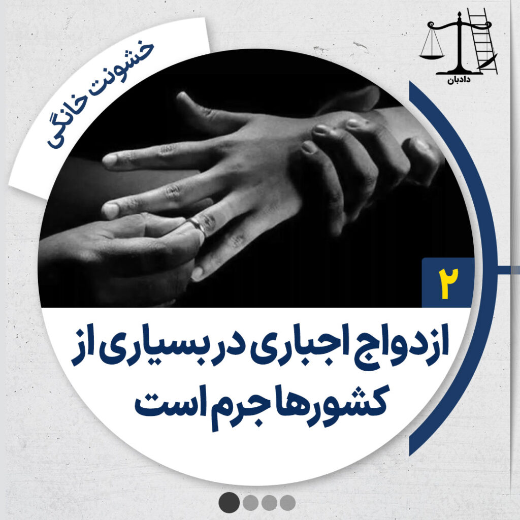 خشونت خانگی ۲- ازدواج اجباری در بسیاری از کشورها جرم است در قوانین و اصول بینالمللی حقوق بشری، از جمله اعلامیه جهانی حقوق بشر و میثاق بینالمللی حقوق مدنی و سیاسی، حق ازدواج تنها با «رضایت آزادانه و کامل طرفین» به رسمیت شناخته شده است. امروزه ازدواج اجباری در بسیاری از کشورها جرم است و […]