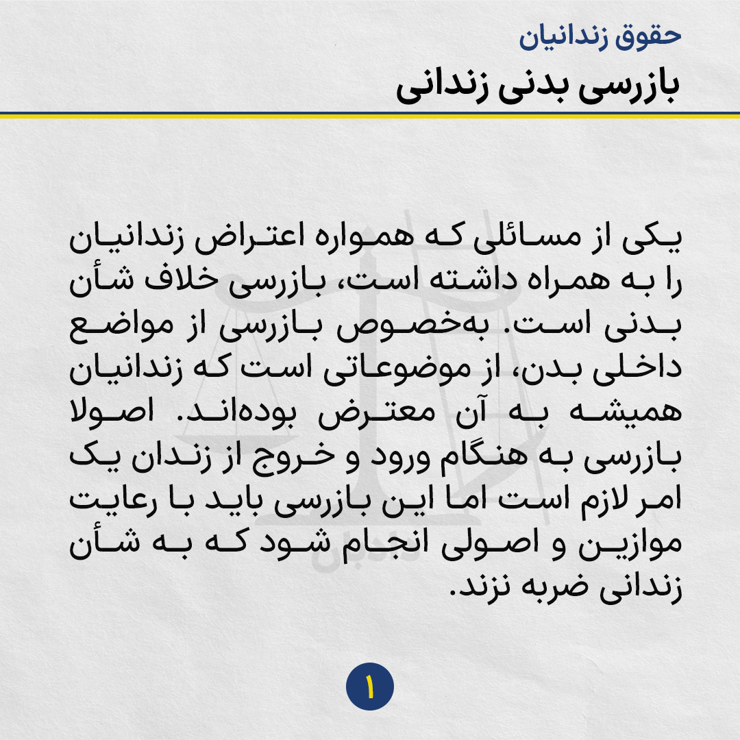 یکی از مسائلی که همواره اعتراض زندانیان را به همراه داشته است، بازرسی خلاف شأن بدنی است. بهخصوص بازرسی از مواضع داخلی بدن، از موضوعاتی است که زندانیان همیشه به آن معترض بودهاند. اصولا بازرسی به هنگام ورود و خروج از زندان یک امر لازم است اما این بازرسی باید با رعایت موازین و اصولی انجام شود که به شأن زندانی ضربه نزند.