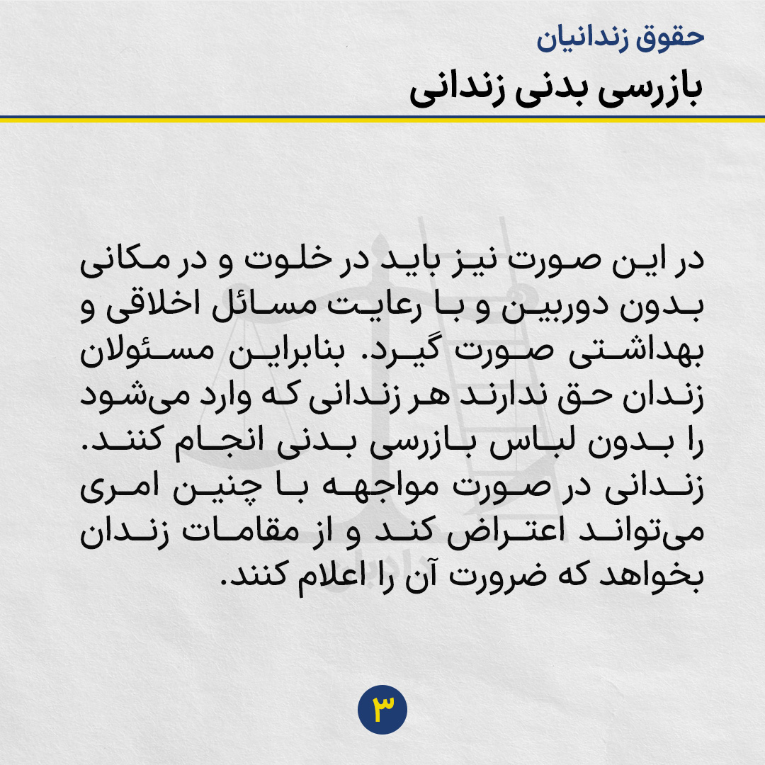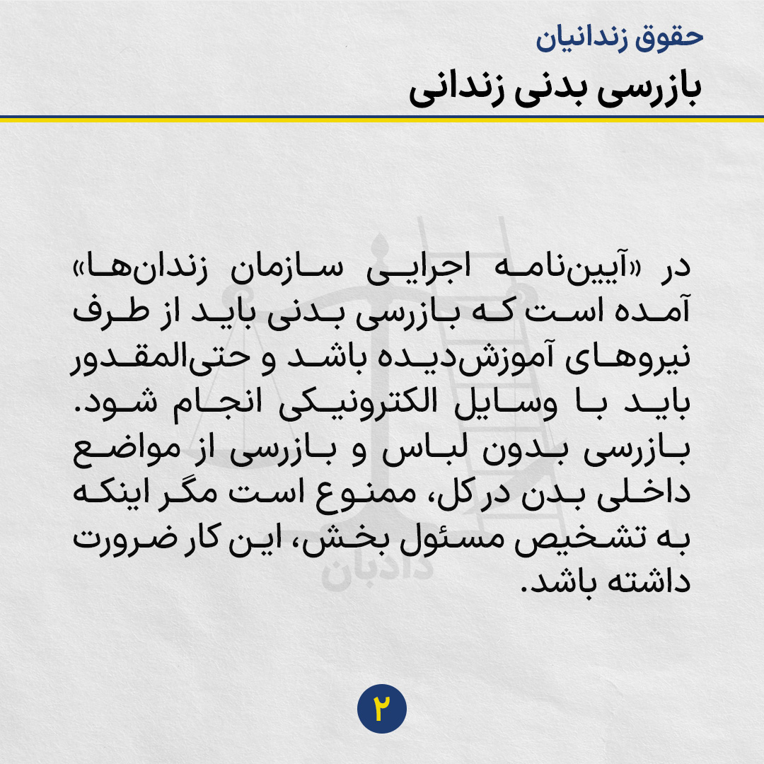 در «آییننامه اجرایی سازمان زندانها» آمده است که بازرسی بدنی باید از طرف نیروهای آموزشدیده باشد و حتیالمقدور باید با وسایل الکترونیکی انجام شود. بازرسی بدون لباس و بازرسی از مواضع داخلی بدن در کل، ممنوع است مگر اینکه به تشخیص مسئول بخش، این کار ضرورت داشته باشد.