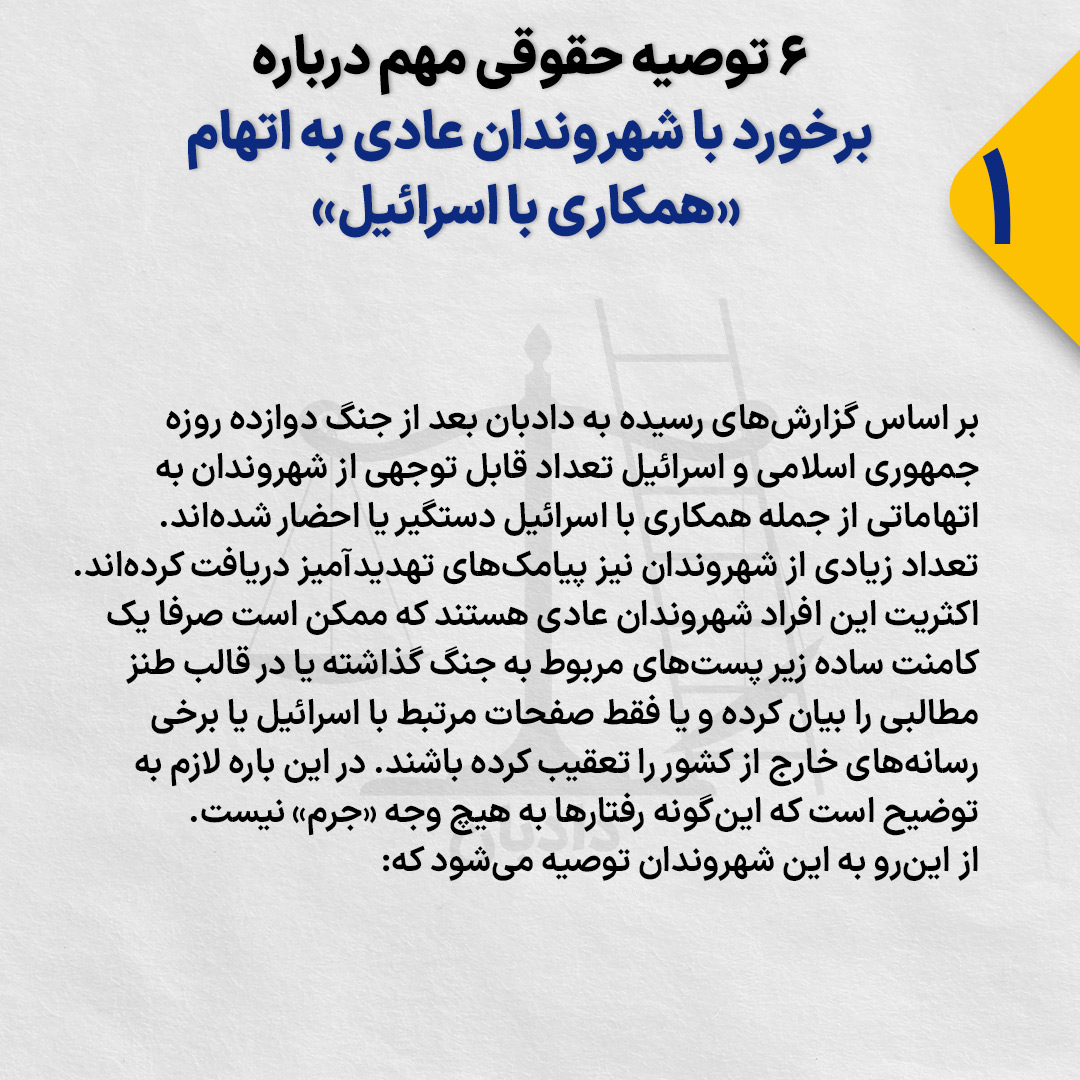 بر اساس گزارشهای رسیده به دادبان بعد از جنگ دوازده روزه جمهوری اسلامی و اسرائیل تعداد قابل توجهی از شهروندان به اتهاماتی از جمله همکاری با اسرائیل دستگیر یا احضار شدهاند. تعداد زیادی از شهروندان نیز پیامکهای تهدیدآمیز دریافت کردهاند. اکثریت این افراد شهروندان عادی هستند که ممکن است صرفا یک کامنت ساده زیر پستهای مربوط به جنگ گذاشته یا در قالب طنز مطالبی را بیان کرده و یا فقط صفحات مرتبط با اسرائیل یا برخی رسانههای خارج از کشور را تعقیب کرده باشند. در این باره لازم به توضیح است که اینگونه رفتارها به هیچ وجه «جرم» نیست. از اینرو به این شهروندان توصیه میشود که: