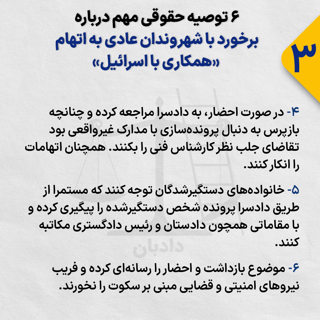 ۳- در بازجوییها اتهامات را نپذیرند و بیان کنند که اقداماتشان در فضای مجازی به هیچ وجه با قصد حمایت از اسرائیل نبوده است