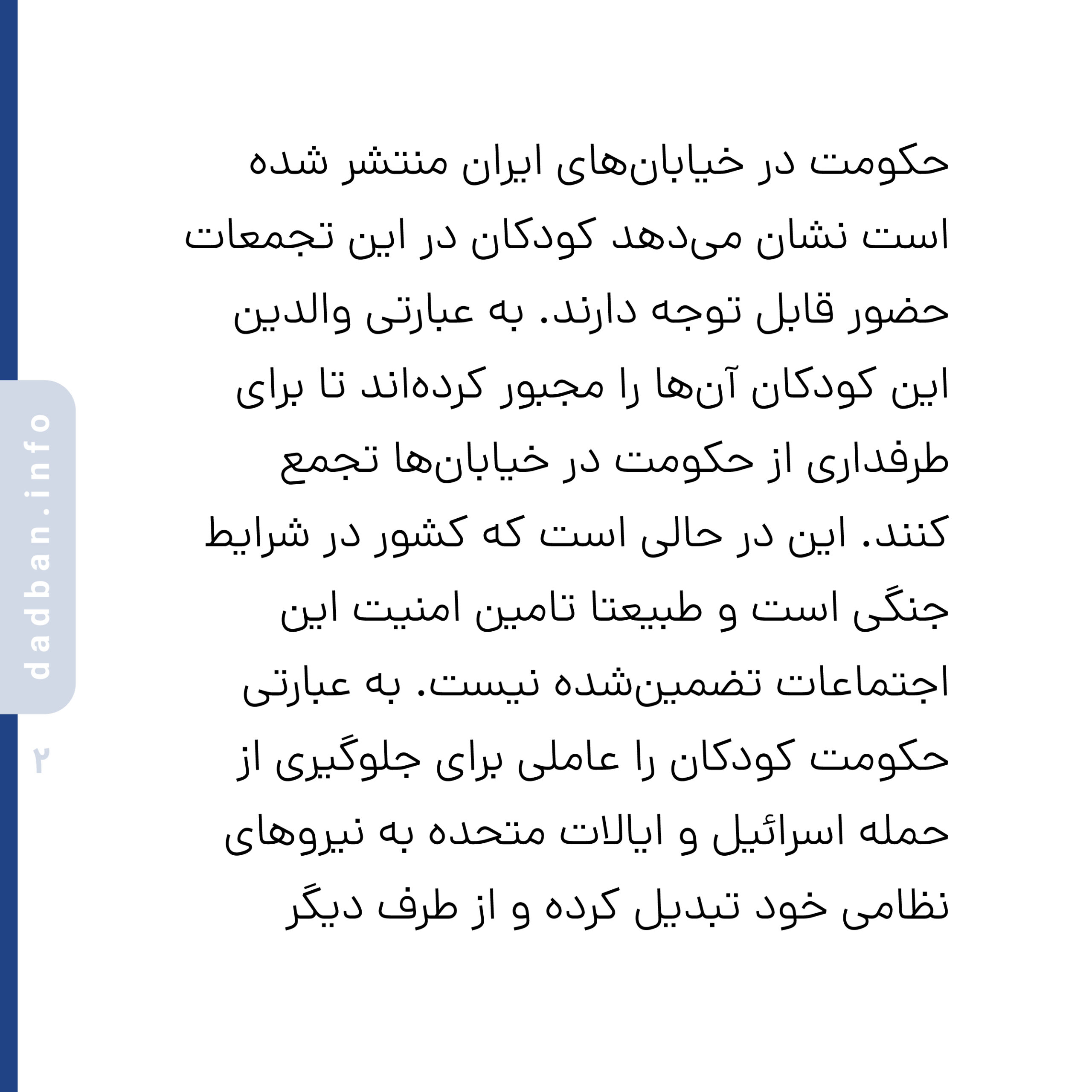 همچنین تصاویری که از تجمعات طرفداران حکومت در خیابانهای ایران منتشر شده است نشان میدهد کودکان در این تجمعات حضور قابل توجه دارند. به عبارتی والدین این کودکان آنها را مجبور کردهاند تا برای طرفداری از حکومت در خیابانها تجمع کنند. این در حالی است که کشور در شرایط جنگی است و طبیعتا تامین امنیت این اجتماعات تضمینشده نیست.