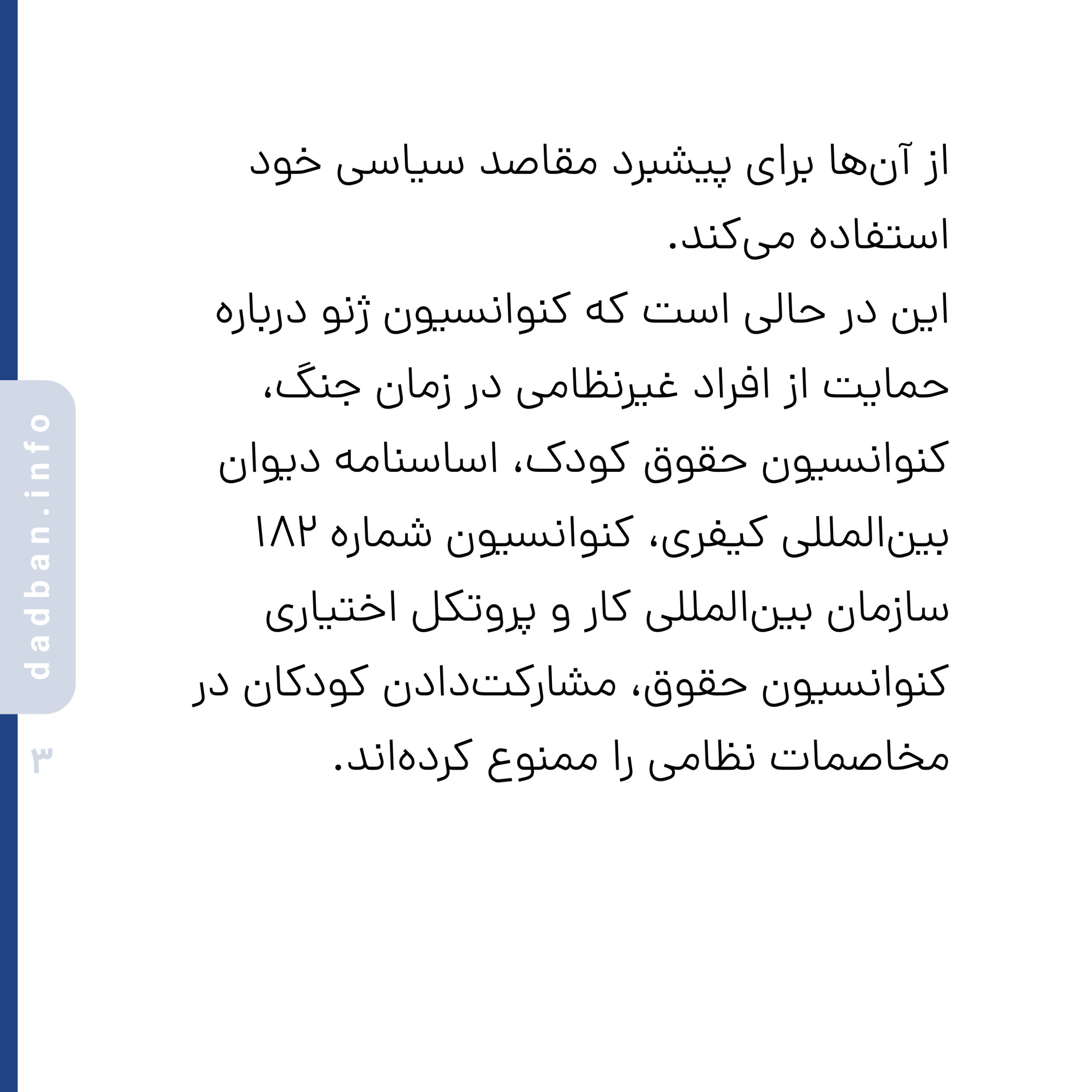 این در حالی است که کنوانسیون ژنو درباره حمایت از افراد غیرنظامی در زمان جنگ، کنوانسیون حقوق کودک، اساسنامه دیوان بینالمللی کیفری، کنوانسیون شماره ۱۸۲ سازمان بینالمللی کار و پروتکل اختیاری کنوانسیون حقوق، مشارکتدادن کودکان در مخاصمات نظامی را ممنوع کردهاند.