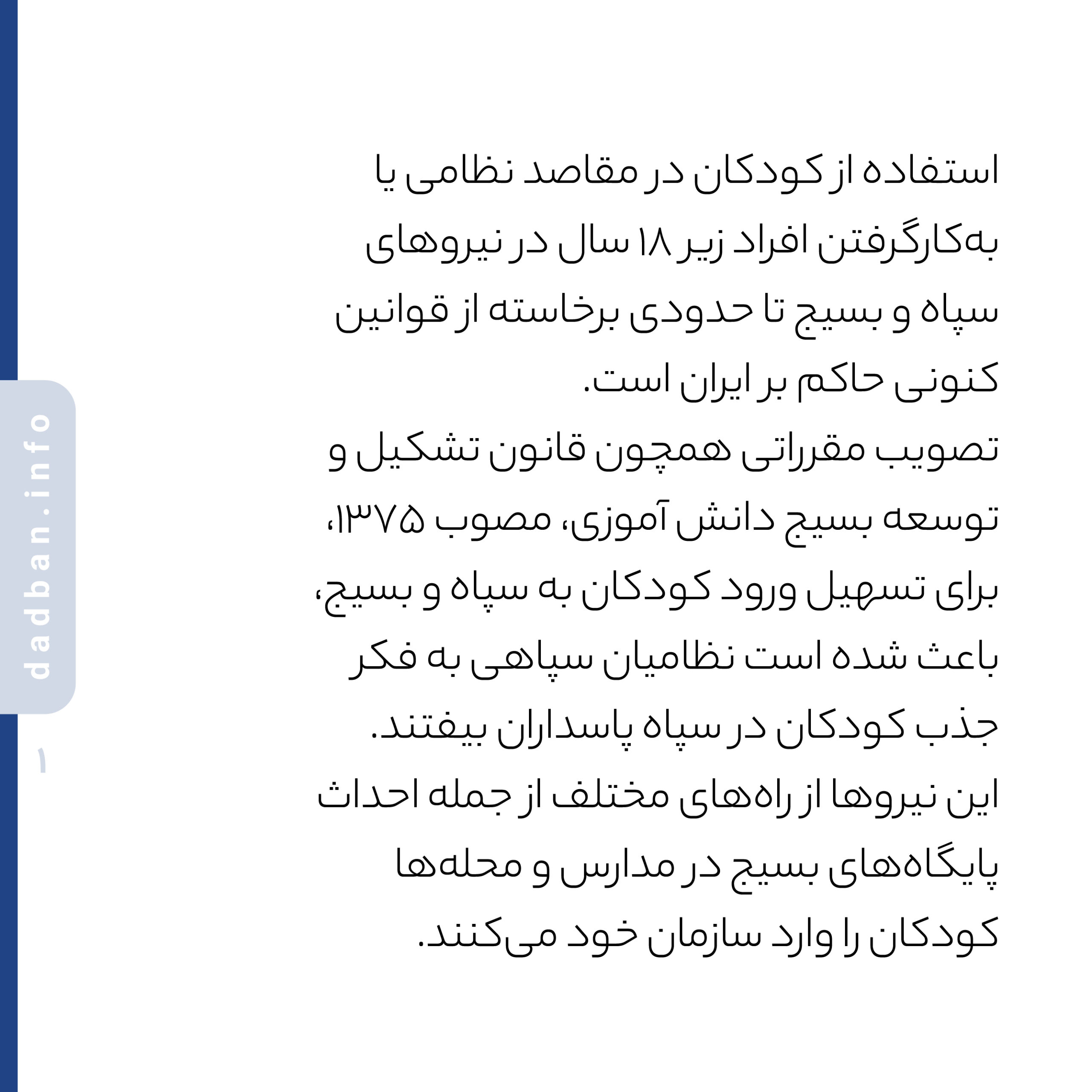 استفاده از کودکان در مقاصد نظامی یا بهکارگرفتن افراد زیر ۱۸ سال در نیروهای سپاه و بسیج تا حدودی برخاسته از قوانین کنونی حاکم بر ایران است.