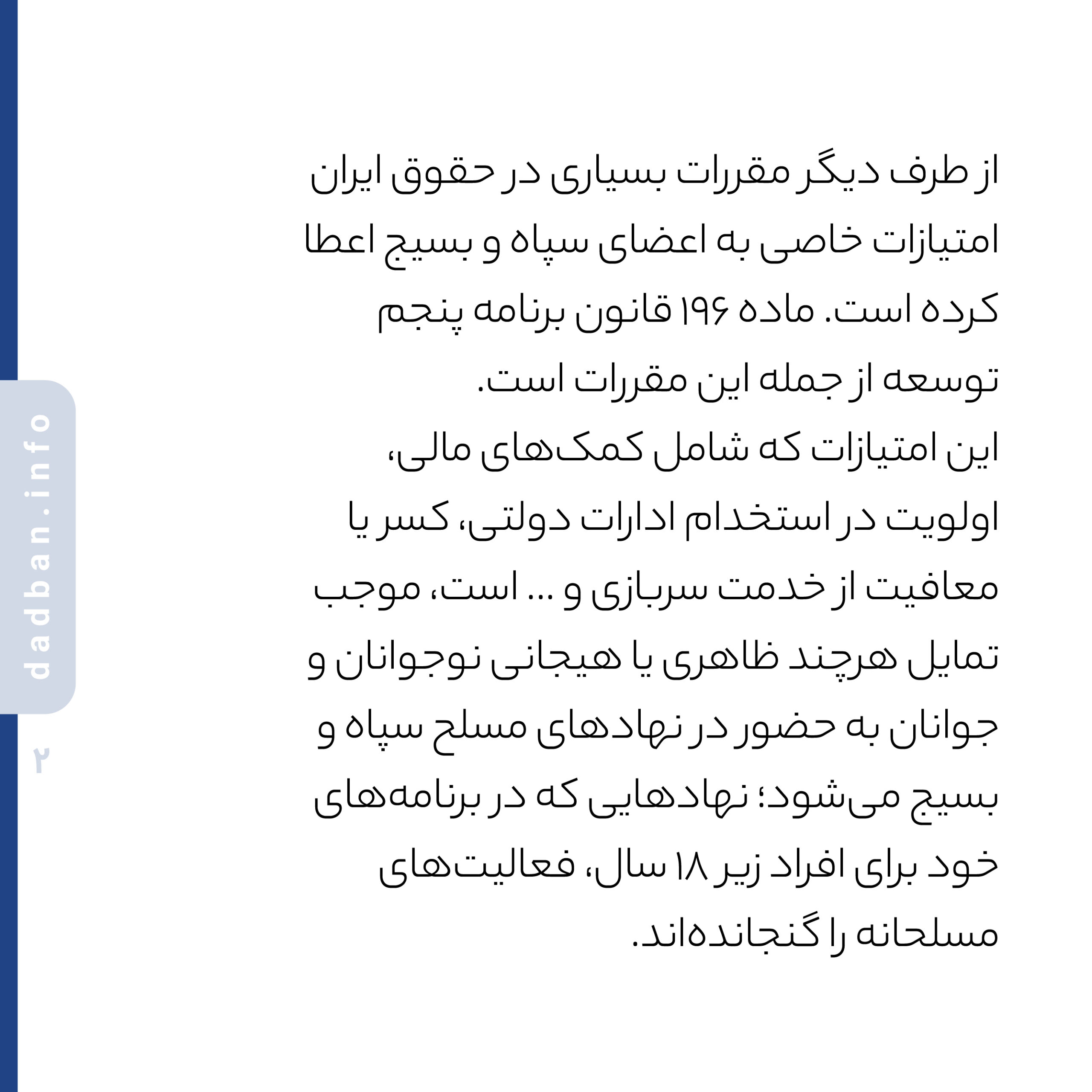 از طرف دیگر مقررات بسیاری در حقوق ایران امتیازات خاصی به اعضای سپاه و بسیج اعطا کرده است. ماده ۱۹۶ قانون برنامه پنجم توسعه از جمله این مقررات است.