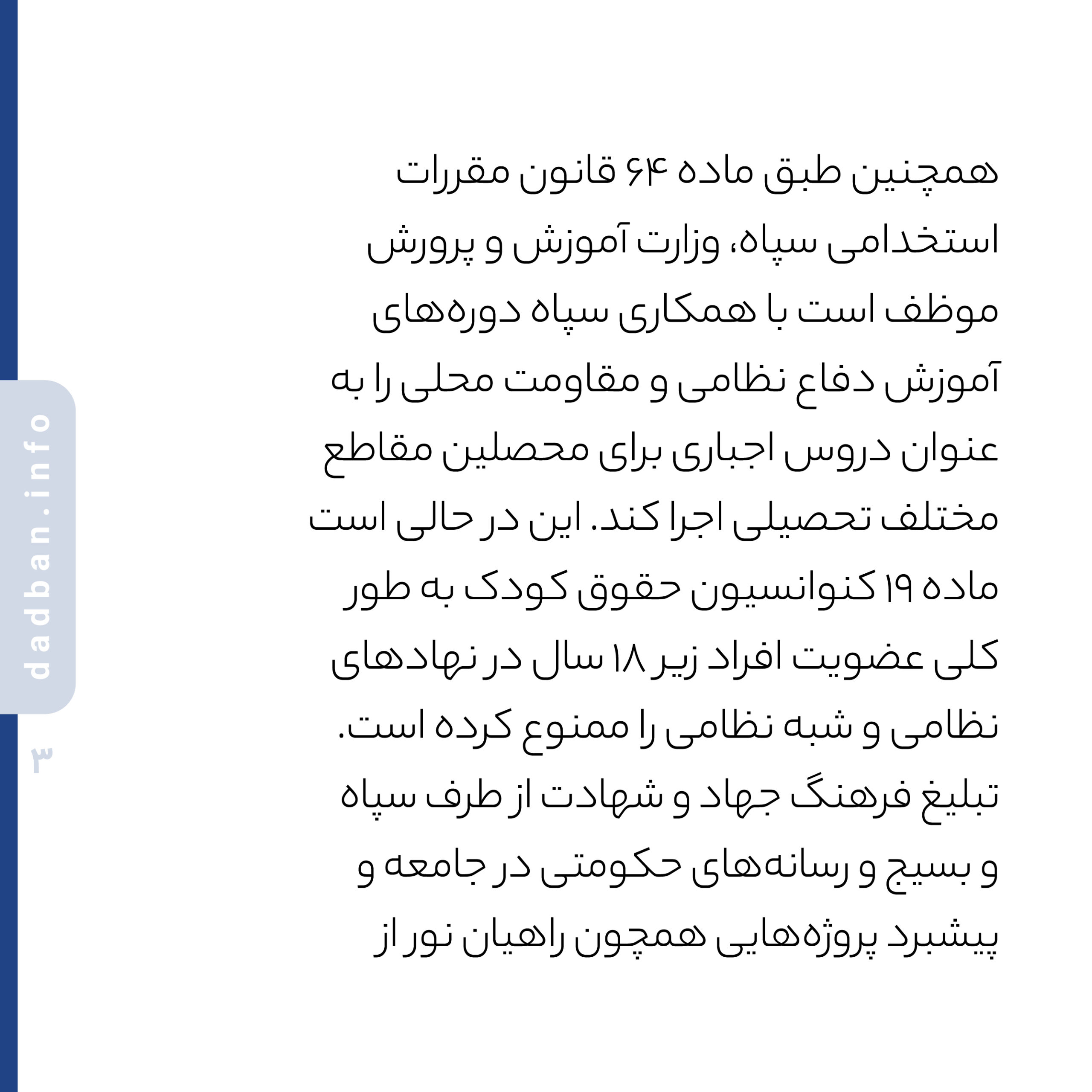 همچنین طبق ماده ۶۴ قانون مقررات استخدامی سپاه، وزارت آموزش و پرورش موظف است با همکاری سپاه دورههای آموزش دفاع نظامی و مقاومت محلی را به عنوان دروس اجباری برای محصلین مقاطع مختلف تحصیلی اجرا کند. این در حالی است ماده ۱۹ کنوانسیون حقوق کودک به طور کلی عضویت افراد زیر ۱۸ سال در نهادهای نظامی و شبه نظامی را ممنوع کرده است.