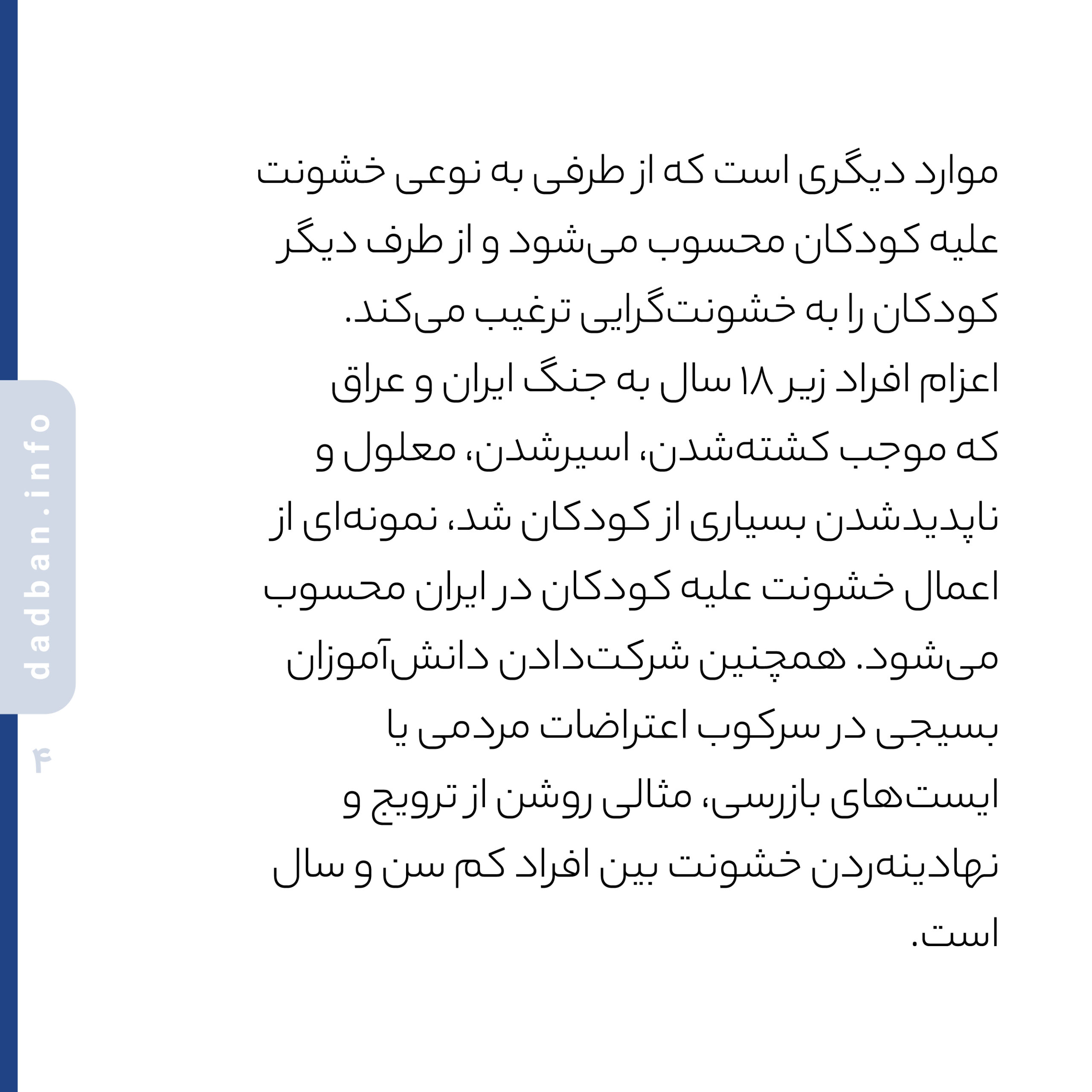 اعزام افراد زیر ۱۸ سال به جنگ ایران و عراق که موجب کشتهشدن، اسیرشدن، معلول و ناپدیدشدن بسیاری از کودکان شد، نمونهای از اعمال خشونت علیه کودکان در ایران محسوب میشود. همچنین شرکتدادن دانشآموزان بسیجی در سرکوب اعتراضات مردمی یا ایستهای بازرسی، مثالی روشن از ترویج و نهادینهردن خشونت بین افراد کم سن و سال است.