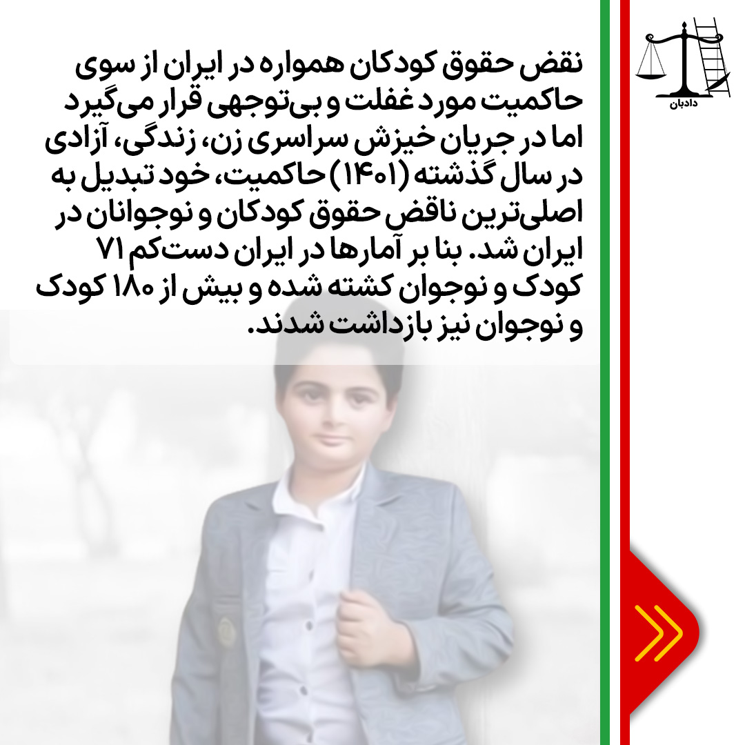 اگرچه موارد نقض حقوق کودکان همواره در ایران از سوی حاکمیت مورد غفلت و بیتوجهی قرار میگیرد اما در جریان سال گذشته (۱۴۰۱) حاکمیت، خود تبدیل به اصلیترین ناقض حقوق کودکان و نوجوانان در ایران شد. بنا بر آمارها در جریان خیزش سراسری زن، زندگی، آزادی در سال گذشته در ایران دستکم ۷۱ کودک و نوجوان کشته شده و بیش از ۱۸۰ کودک و نوجوان نیز بازداشت شدند.