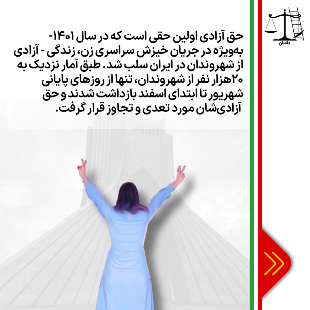 حق آزادی اولین حقی است که در سال ۱۴۰۱- به‌‌ویژه در جریان خیزش سراسری زن، زندگی – آزادی از شهروندان در ایران سلب شد. آن‌طور که آمارها نشان می‌دهند نزدیک به ۲۰هزار نفر از شهروندان در ایران تنها از روزهای پایانی شهریور ماه تا ابتدای اسفند بازداشت شدند و حق آزادی‌شان مورد تعدی و تجاوز قرار گرفت.