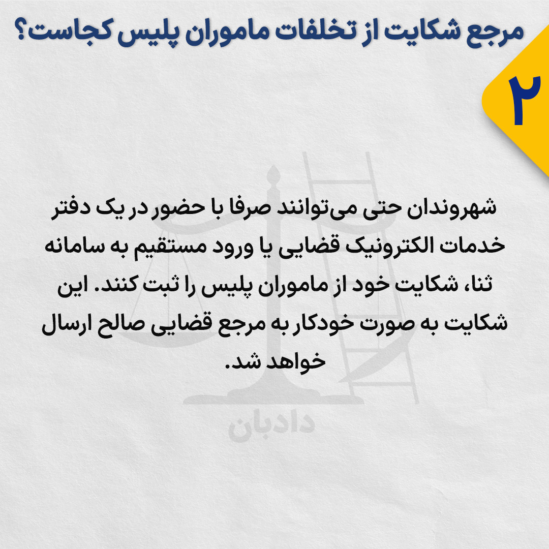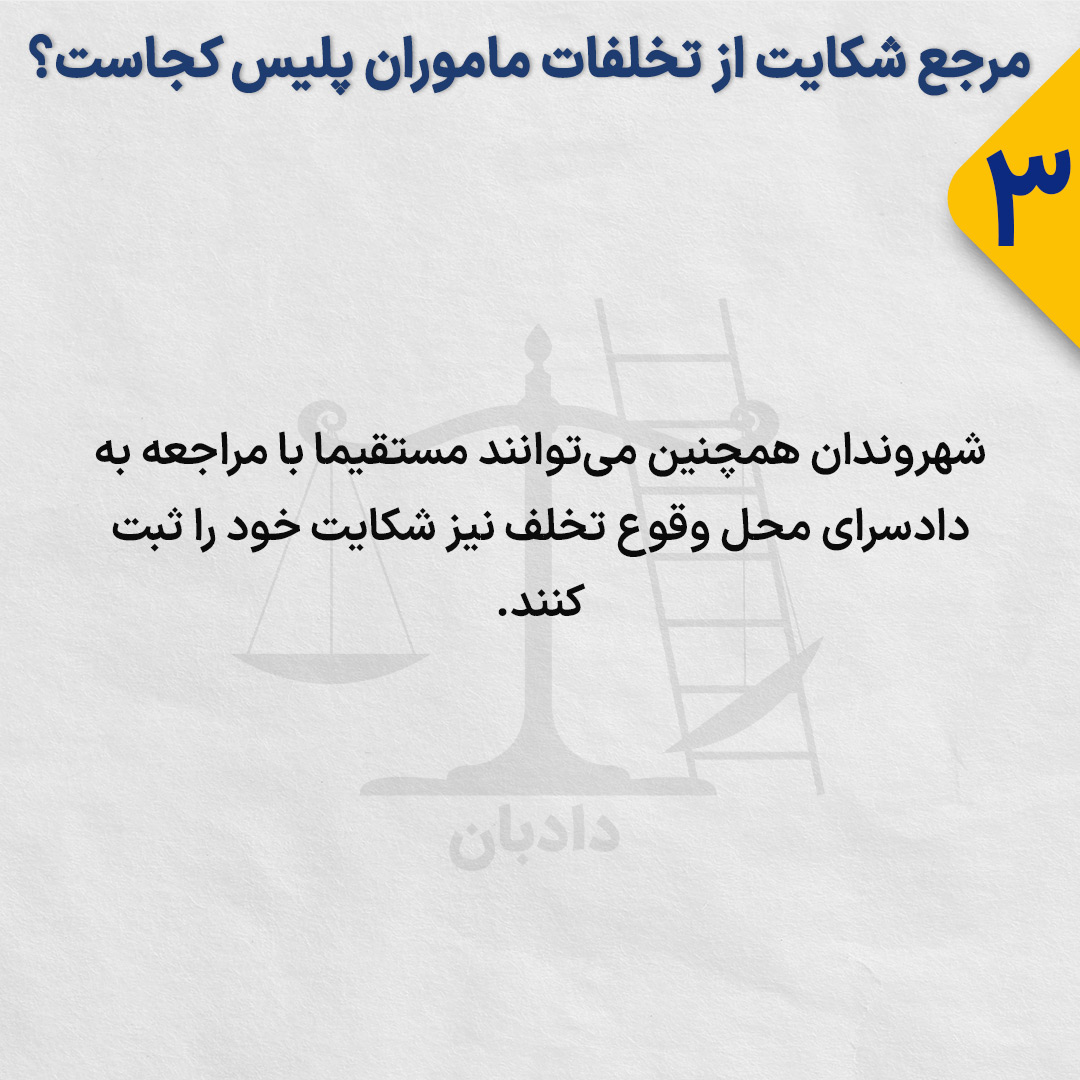 شهروندان همچنین میتوانند مستقیما با مراجعه به دادسرای محل وقوع تخلف نیز شکایت خود را ثبت کنند.