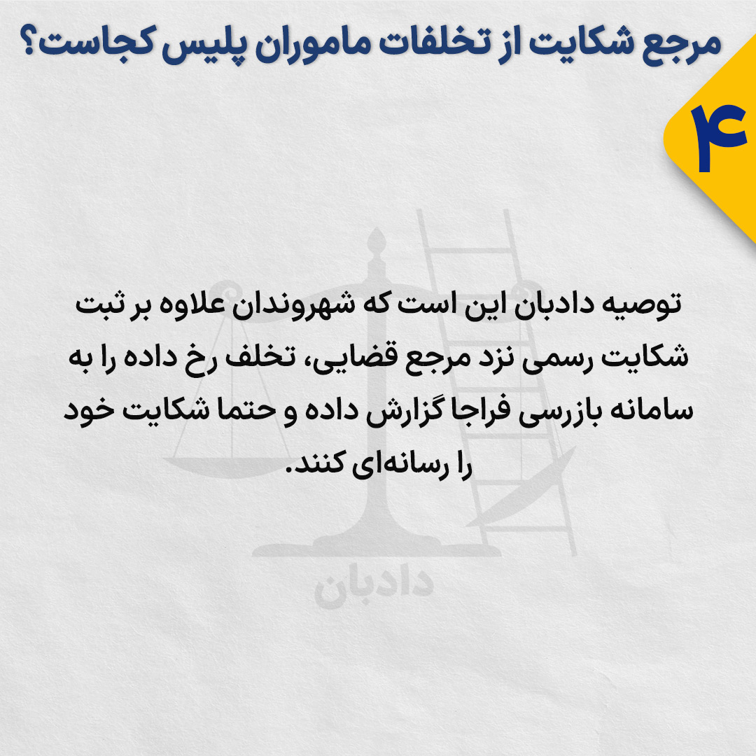 توصیه دادبان این است که شهروندان علاوه بر ثبت شکایت رسمی نزد مرجع قضایی، تخلف رخ داده را به سامانه بازرسی فراجا گزارش داده و حتما شکایت خود را رسانهای کنند