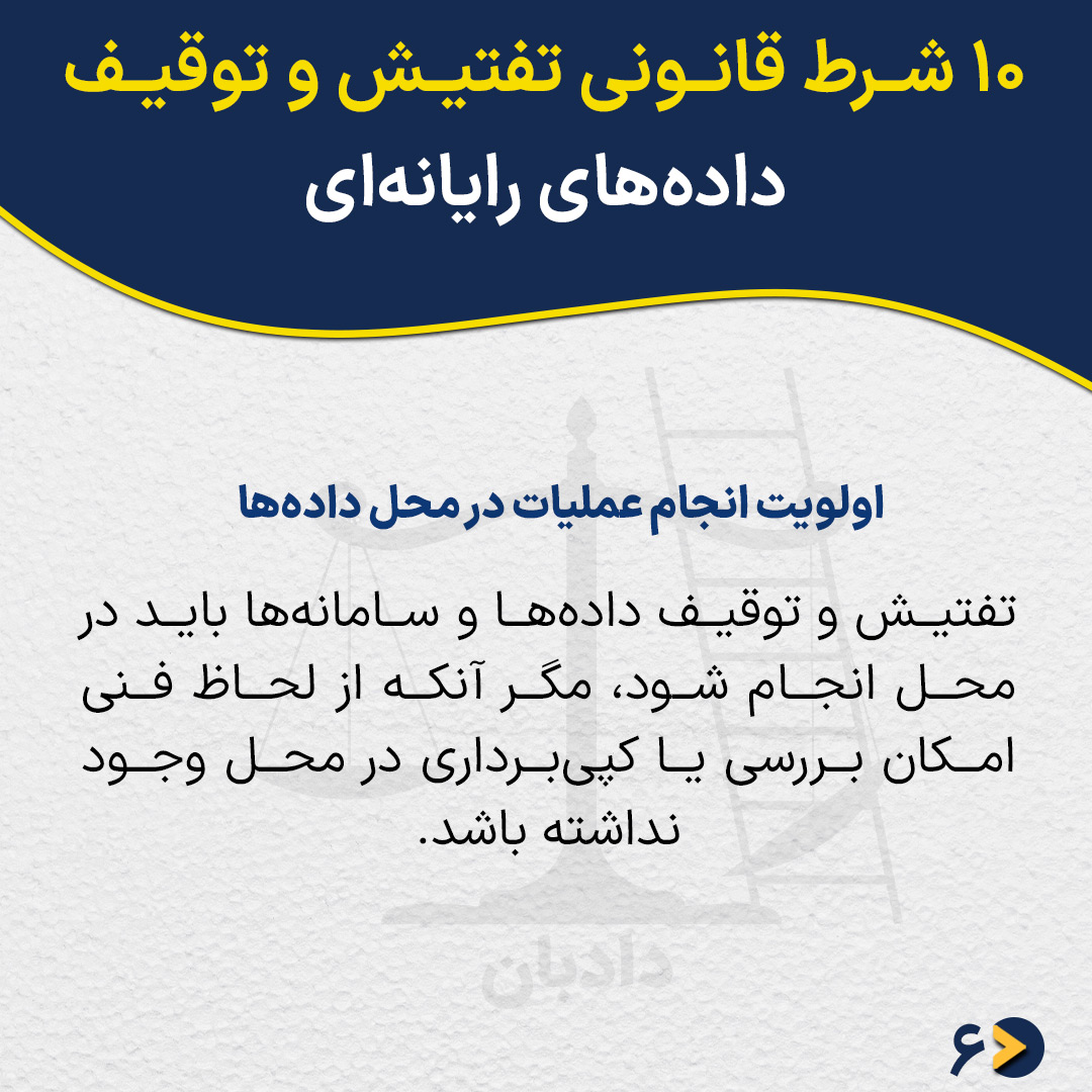 تفتیش و توقیف دادهها و سامانهها باید در محل انجام شود، مگر آنکه از لحاظ فنی امکان بررسی یا کپیبرداری در محل وجود نداشته باشد.