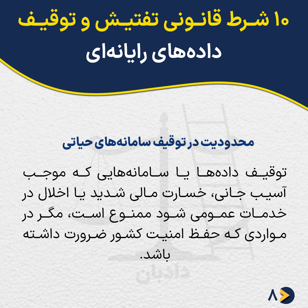 توقیف دادهها یا سامانههایی که موجب آسیب جانی، خسارت مالی شدید یا اخلال در خدمات عمومی شود ممنوع است، مگر در مواردی که حفظ امنیت کشور ضرورت داشته باشد.