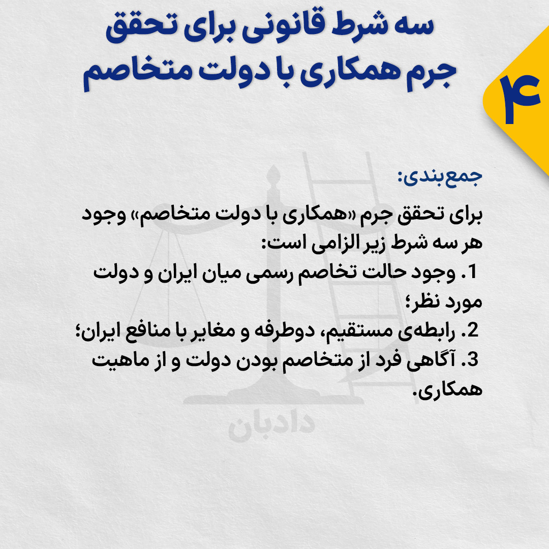 برای تحقق جرم «همکاری با دولت متخاصم» وجود هر سه شرط زیر الزامی است: