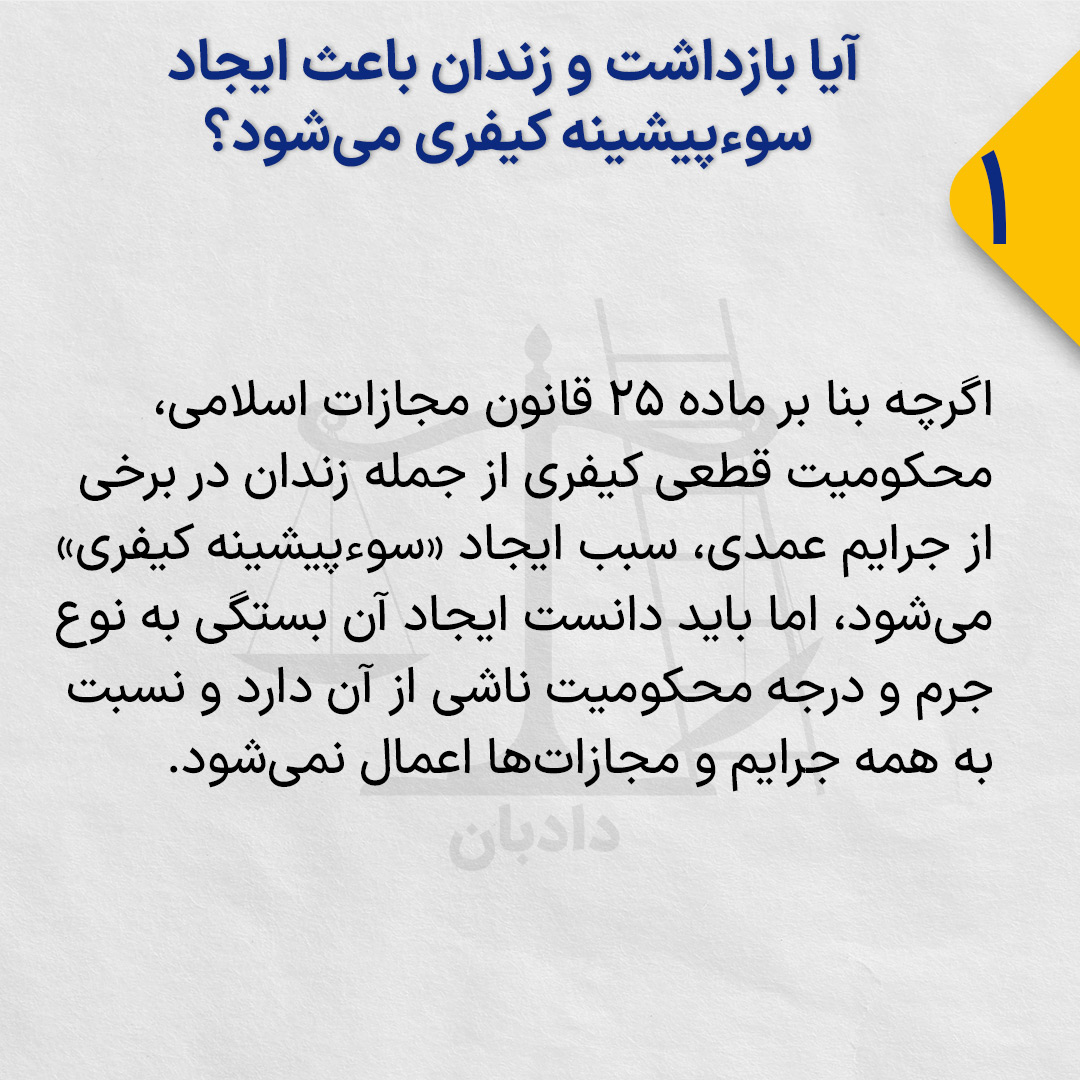 اگرچه بنا بر ماده ۲۵ قانون مجازات اسلامی، محکومیت قطعی کیفری از جمله زندان در برخی از جرایم عمدی، سبب ایجاد «سوءپیشینه کیفری» می‌شود، اما باید دانست ایجاد آن بستگی به نوع جرم و درجه محکومیت ناشی از آن دارد و نسبت به همه جرایم و مجازات‌ها اعمال نمی‌شود.
