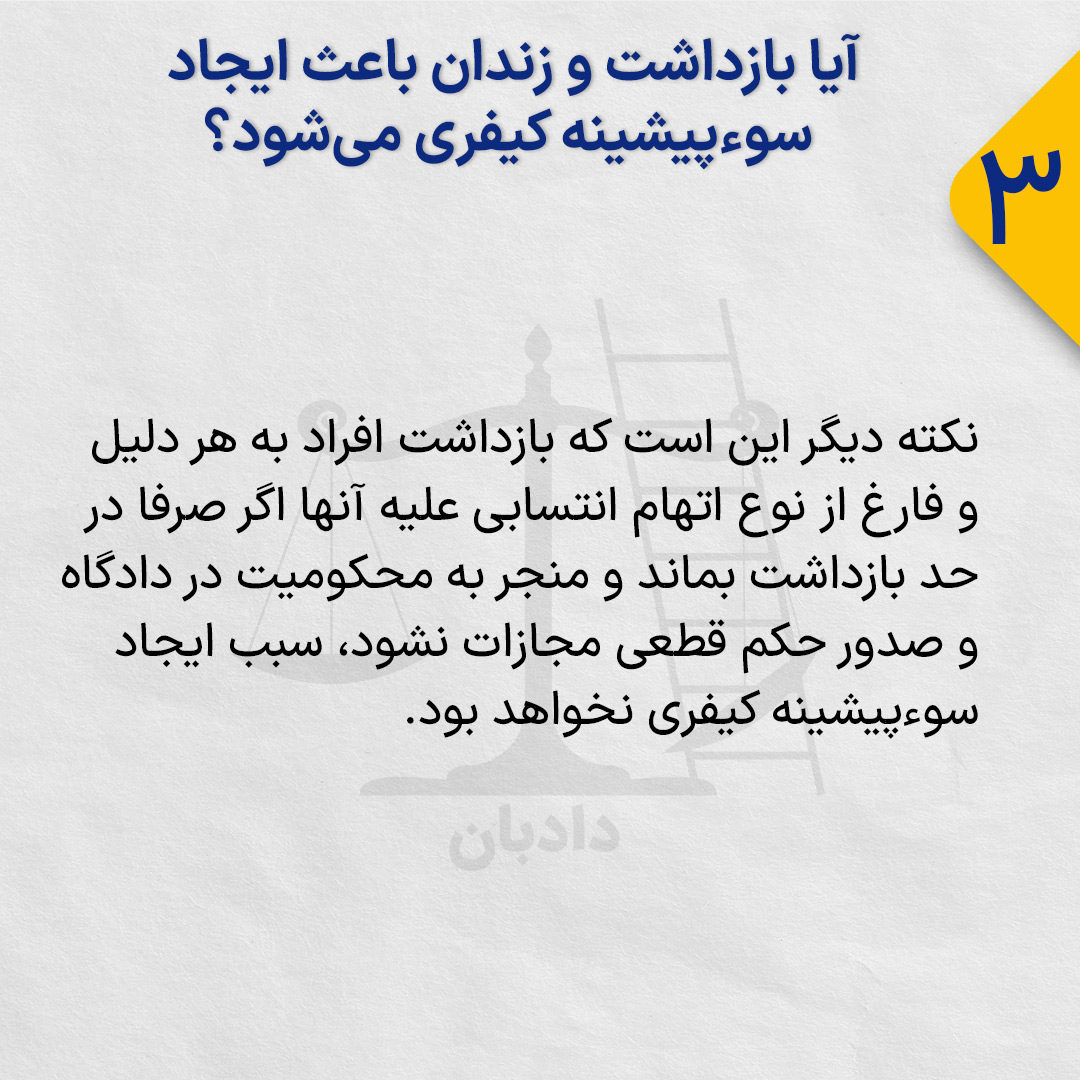 نکته دیگر این است که بازداشت افراد به هر دلیل و فارغ از نوع اتهام انتسابی علیه آنها اگر صرفا در حد بازداشت بماند و منجر به محکومیت در دادگاه و صدور حکم قطعی مجازات نشود، سبب ایجاد سوءپیشینه کیفری نخواهد بود.