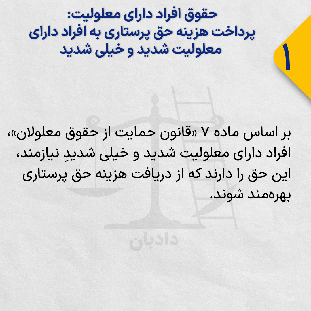 بر اساس ماده ۷ «قانون حمایت از حقوق معلولان»، افراد دارای معلولیت شدید و خیلی شدیدِ نیازمند، این حق را دارند که از دریافت هزینه حق پرستاری بهره‌مند شوند.