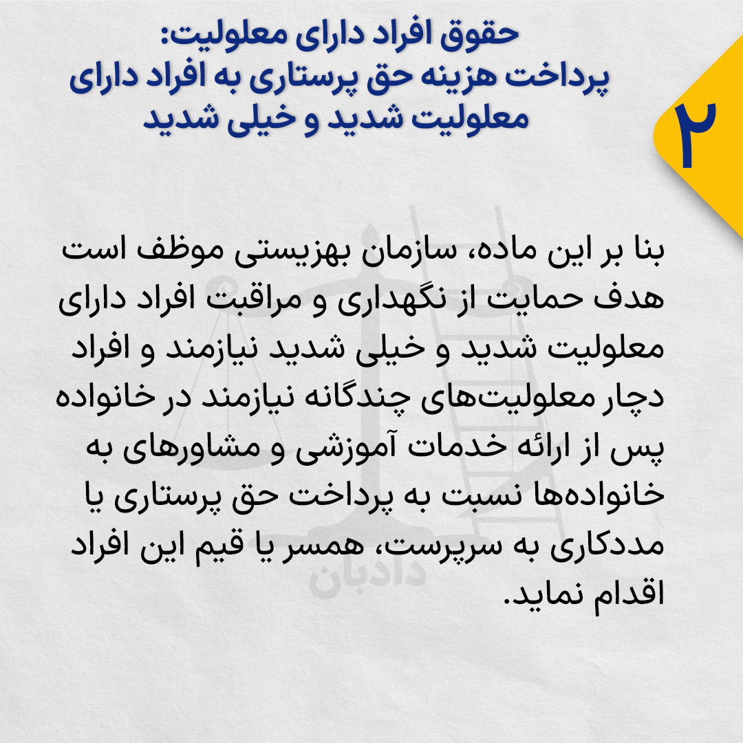 بنا بر این ماده، سازمان بهزیستی موظف است هدف حمایت از نگهداری و مراقبت افراد دارای معلولیت شدید و خیلی شدید نیازمند و افراد دچار معلولیت‏‌های چندگانه نیازمند در خانواده پس از ارائه خدمات آموزشی و مشاوره‏ای به خانواده‌‏ها نسبت به پرداخت حق پرستاری یا مددکاری به سرپرست، همسر یا قیم این افراد اقدام نماید.