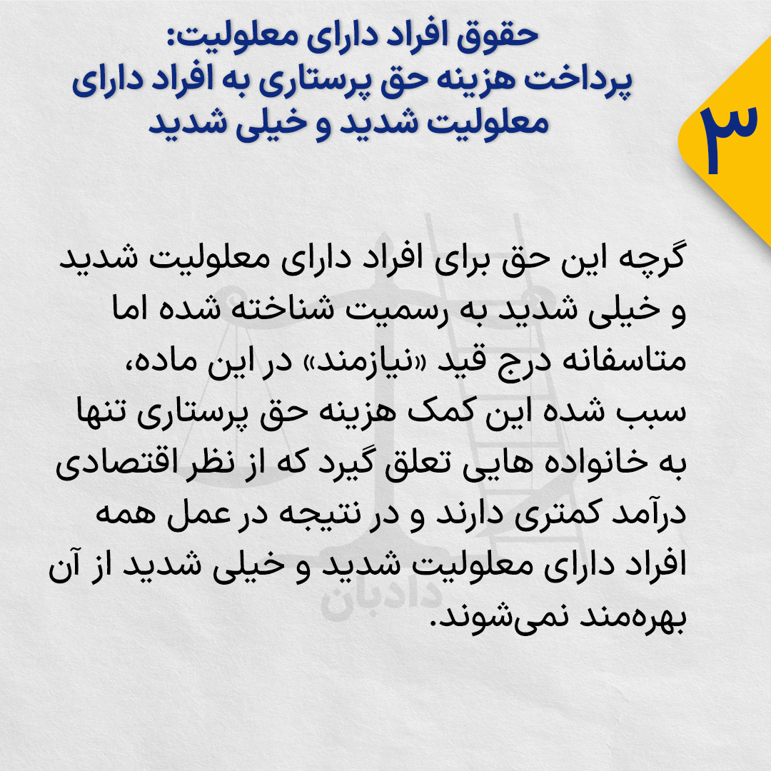 گرچه این حق برای افراد دارای معلولیت شدید و خیلی شدید به رسمیت شناخته شده اما متاسفانه درج قید «نیازمند» در این ماده، سبب شده این کمک هزینه حق پرستاری تنها به خانواده هایی تعلق گیرد که از نظر اقتصادی درآمد کمتری دارند و در نتیجه در عمل همه افراد دارای معلولیت شدید و خیلی شدید از آن بهره‌مند نمی‌شوند.
