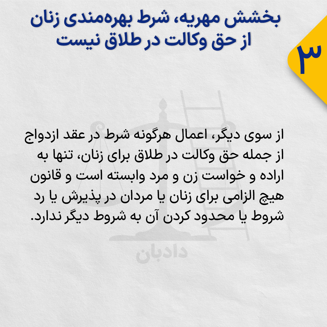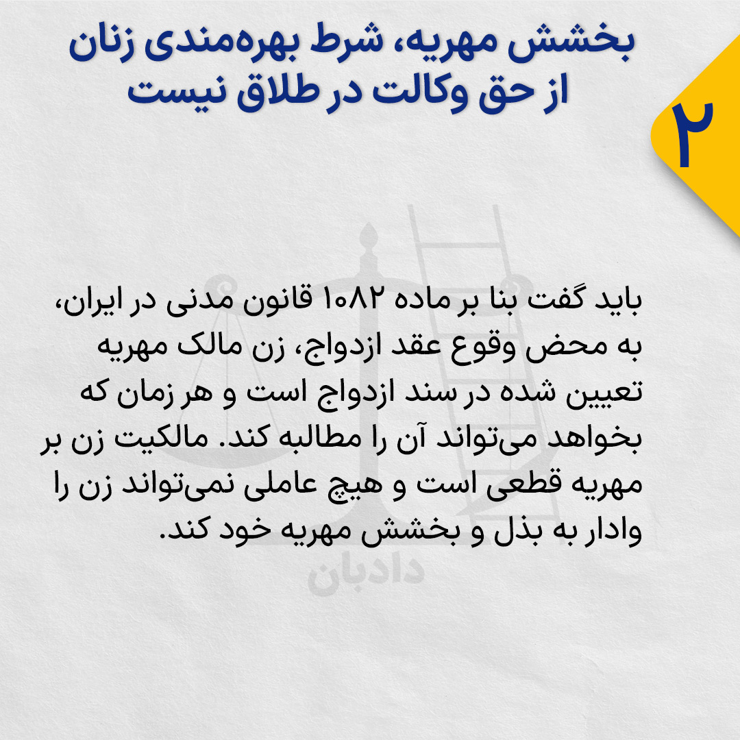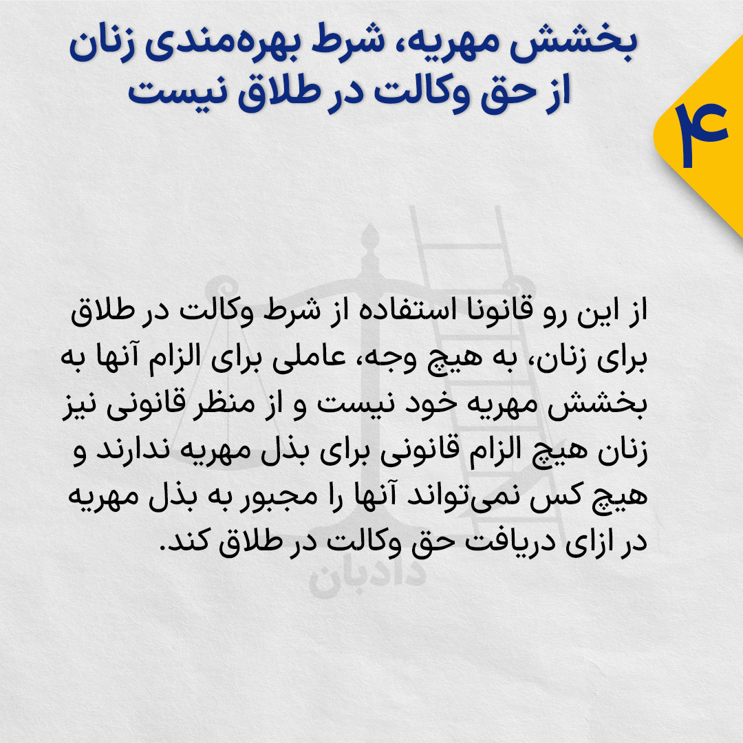 از این رو قانونا استفاده از شرط وکالت در طلاق برای زنان، به هیچ وجه، عاملی برای الزام آنها به بخشش مهریه خود نیست و از منظر قانونی نیز زنان هیچ الزام قانونی برای بذل مهریه ندارند و هیچ کس نمی‌تواند آنها را مجبور به بذل مهریه در ازای دریافت حق وکالت در طلاق کند.