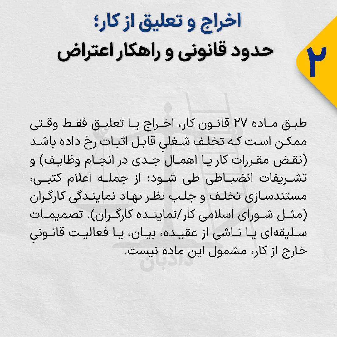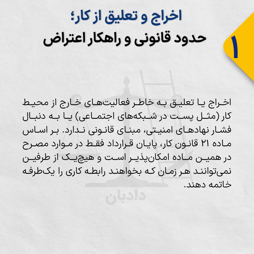 اخراج یا تعلیق به خاطر فعالیتهای خارج از محیط کار (مثل پست در شبکههای اجتماعی) یا به دنبال فشار نهادهای امنیتی، مبنای قانونی ندارد. بر اساس ماده ۲۱ قانون کار، پایان قرارداد فقط در موارد مصرح در همین ماده امکانپذیر است و هیچیک از طرفین نمیتوانند هر زمان که بخواهند رابطه کاری را یکطرفه خاتمه دهند.