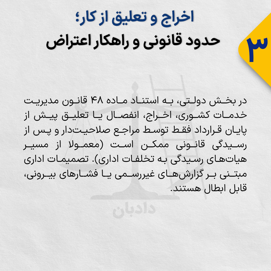در بخش دولتی، به استناد ماده ۴۸ قانون مدیریت خدمات کشوری، اخراج، انفصال یا تعلیق پیش از پایان قرارداد فقط توسط مراجع صلاحیتدار و پس از رسیدگی قانونی ممکن است (معمولا از مسیر هیاتهای رسیدگی به تخلفات اداری). تصمیمات اداری مبتنی بر گزارشهای غیررسمی یا فشارهای بیرونی، قابل ابطال هستند.