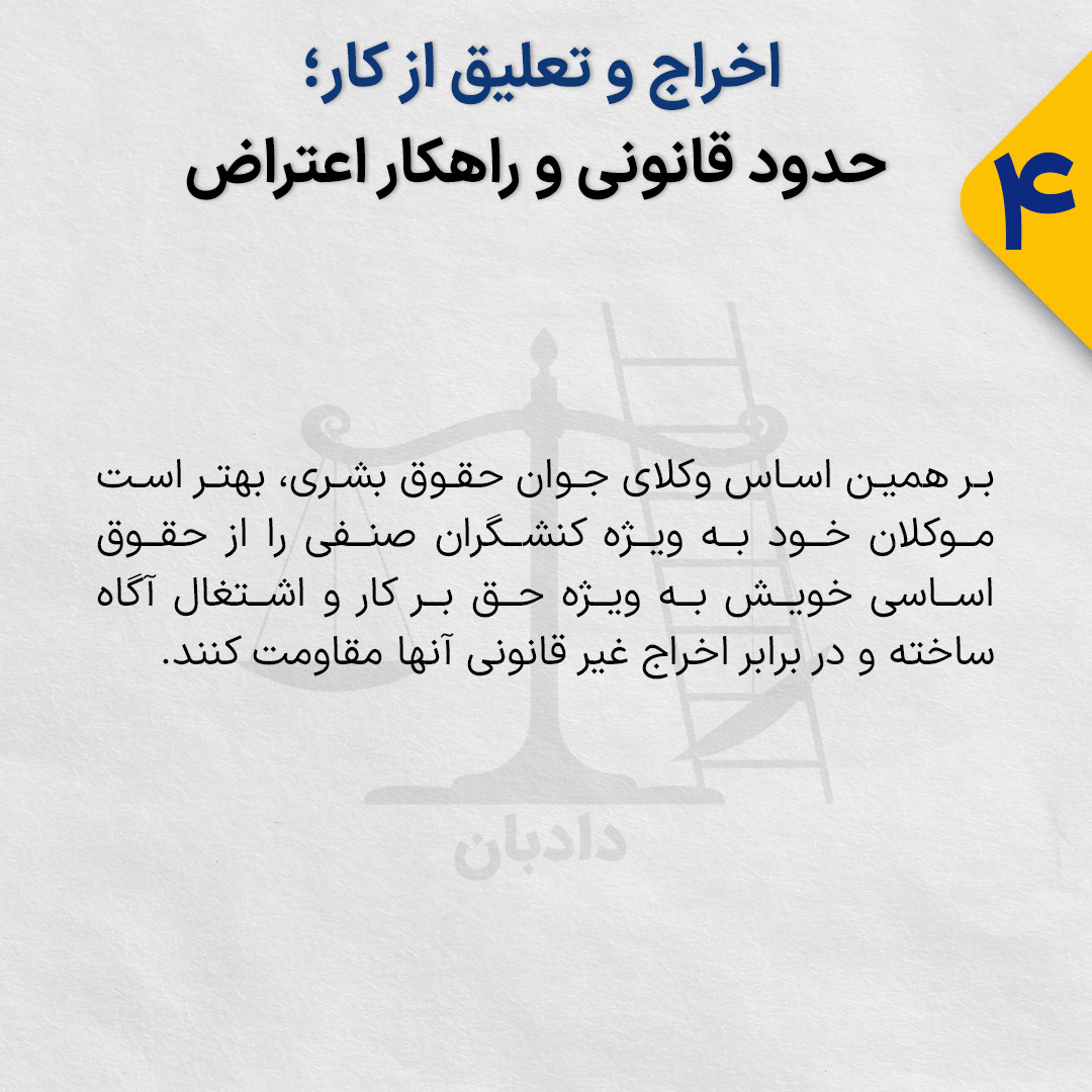 بر همین اساس وکلای جوان حقوق بشری، بهتر است موکلان خود به ویژه کنشگران صنفی را از حقوق اساسی خویش به ویژه حق بر کار و اشتغال آگاه ساخته و در برابر اخراج غیر قانونی آنها مقاومت کنند.