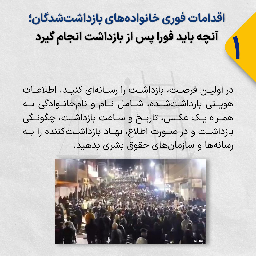 در اولین فرصت، بازداشت را رسانهای کنید. اطلاعات هویتی بازداشتشده، شامل نام و نامخانوادگی به همراه یک عکس، تاریخ و ساعت بازداشت، چگونگی بازداشت و در صورت اطلاع، نهاد بازداشتکننده را به رسانهها و سازمانهای حقوق بشری بدهید.