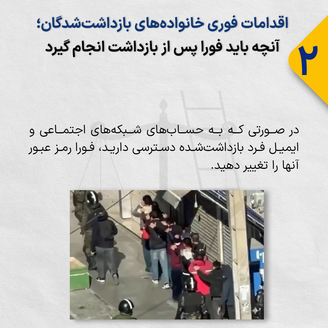 در صورتی که به حسابهای شبکههای اجتماعی و ایمیل فرد بازداشتشده دسترسی دارید، فورا رمز عبور آنها را تغییر دهید.