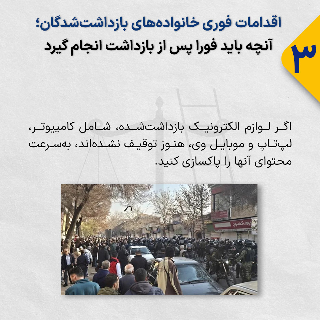اگر لوازم الکترونیک بازداشتشده، شامل کامپیوتر، لپتاپ و موبایل وی، هنوز توقیف نشدهاند، بهسرعت محتوای آنها را پاکسازی کنید.
