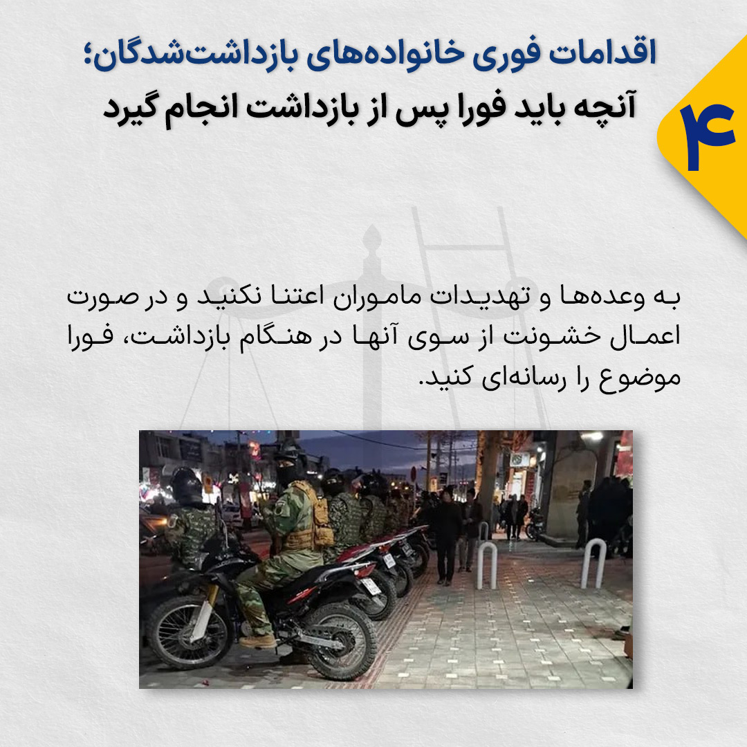 به وعدهها و تهدیدات ماموران اعتنا نکنید و در صورت اعمال خشونت از سوی آنها در هنگام بازداشت، فورا موضوع را رسانهای کنید.