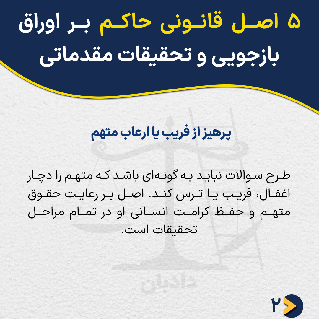 طرح سوالات نباید به گونهای باشد که متهم را دچار اغفال، فریب یا ترس کند. اصل بر رعایت حقوق متهم و حفظ کرامت انسانی او در تمام مراحل تحقیقات است.