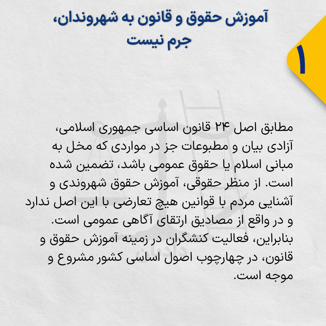 مطابق اصل ۲۴ قانون اساسی جمهوری اسلامی، آزادی بیان و مطبوعات جز در مواردی که مخل به مبانی اسلام یا حقوق عمومی باشد، تضمین شده است. از منظر حقوقی، آموزش حقوق شهروندی و آشنایی مردم با قوانین هیچ تعارضی با این اصل ندارد و در واقع از مصادیق ارتقای آگاهی عمومی است. بنابراین، فعالیت کنشگران در زمینه آموزش حقوق و قانون، در چهارچوب اصول اساسی کشور مشروع و موجه است.