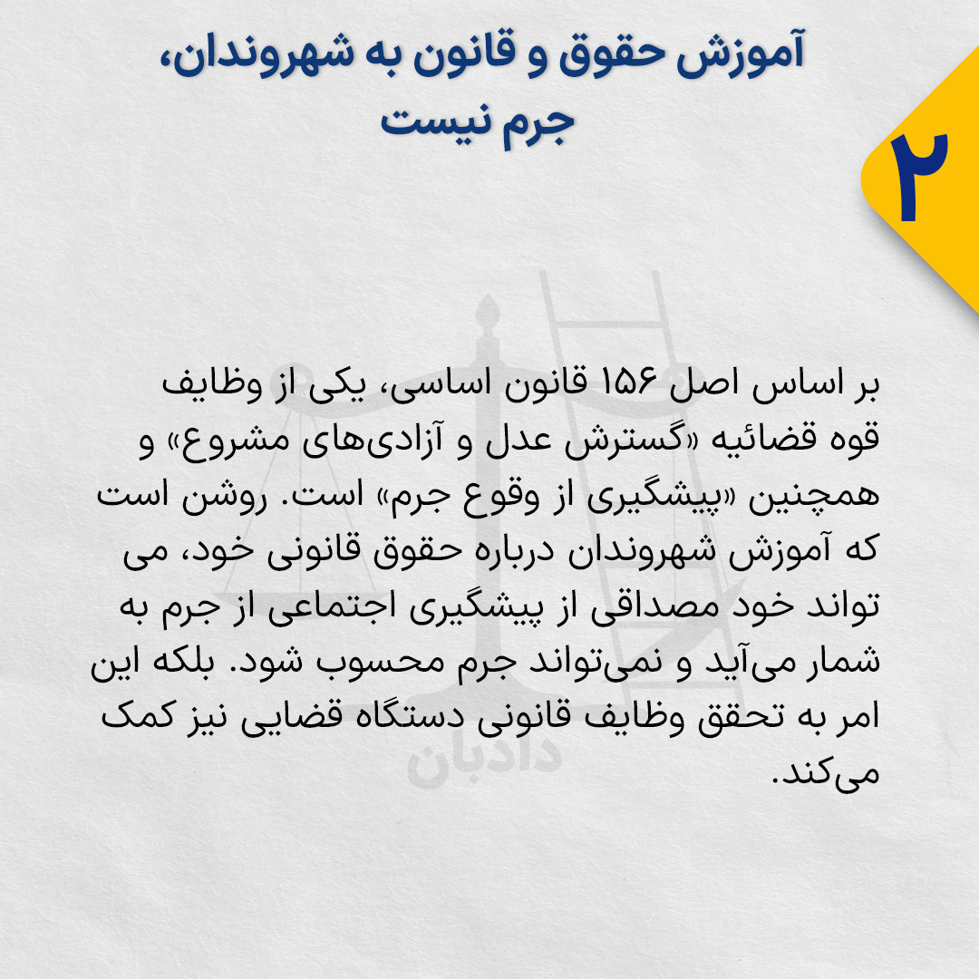 بر اساس اصل ۱۵۶ قانون اساسی، یکی از وظایف قوه قضائیه «گسترش عدل و آزادیهای مشروع» و همچنین «پیشگیری از وقوع جرم» است. روشن است که آموزش شهروندان درباره حقوق قانونی خود، میتواند خود مصداقی از پیشگیری اجتماعی از جرم به شمار میآید و نمیتواند جرم محسوب شود. بلکه این امر به تحقق وظایف قانونی دستگاه قضایی نیز کمک میکند.