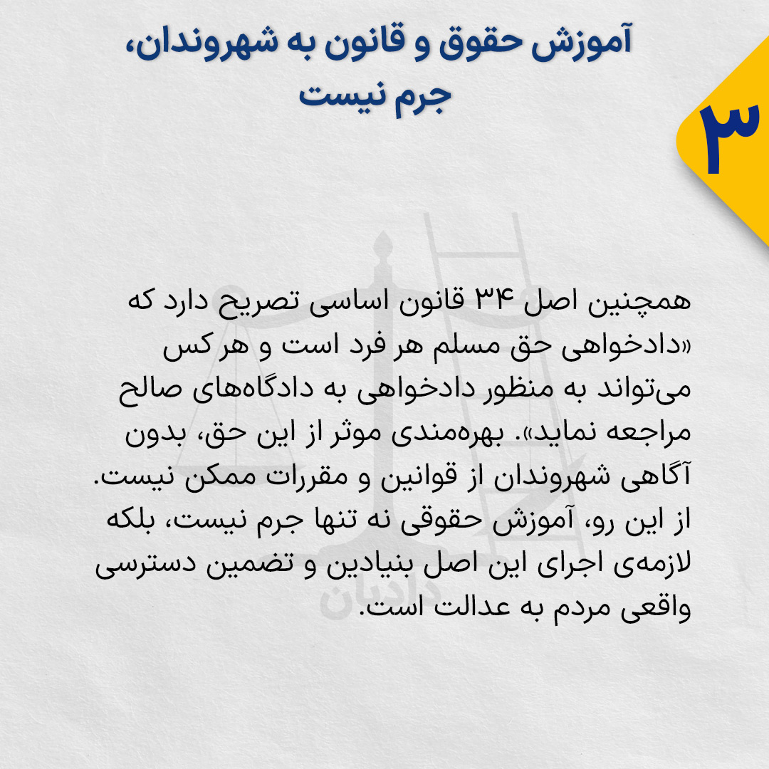 همچنین اصل ۳۴ قانون اساسی تصریح دارد که «دادخواهی حق مسلم هر فرد است و هر کس میتواند به منظور دادخواهی به دادگاههای صالح مراجعه نماید». بهرهمندی موثر از این حق، بدون آگاهی شهروندان از قوانین و مقررات ممکن نیست. از این رو، آموزش حقوقی نه تنها جرم نیست، بلکه لازمهی اجرای این اصل بنیادین و تضمین دسترسی واقعی مردم به عدالت است.