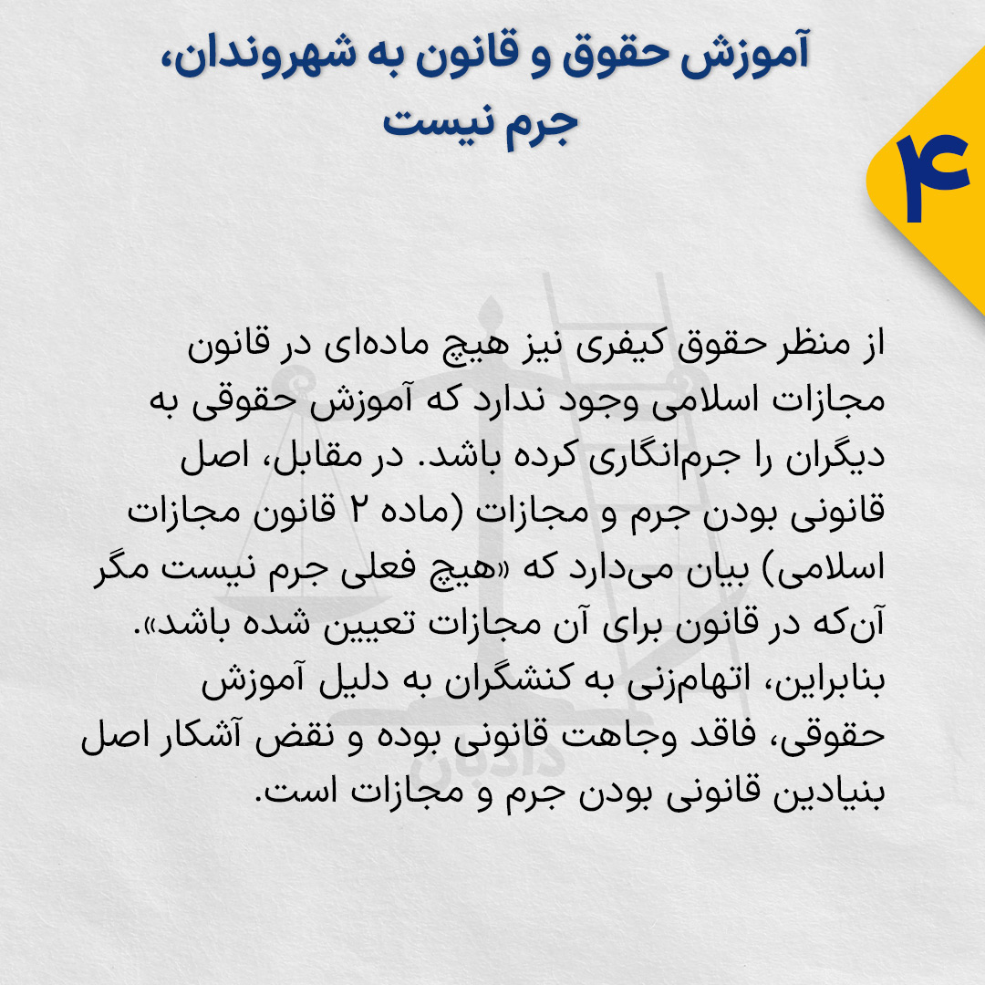از منظر حقوق کیفری نیز هیچ مادهای در قانون مجازات اسلامی وجود ندارد که آموزش حقوقی به دیگران را جرمانگاری کرده باشد. در مقابل، اصل قانونی بودن جرم و مجازات (ماده ۲ قانون مجازات اسلامی) بیان میدارد که «هیچ فعلی جرم نیست مگر آنکه در قانون برای آن مجازات تعیین شده باشد». بنابراین، اتهامزنی به کنشگران به دلیل آموزش حقوقی، فاقد وجاهت قانونی بوده و نقض آشکار اصل بنیادین قانونی بودن جرم و مجازات است.