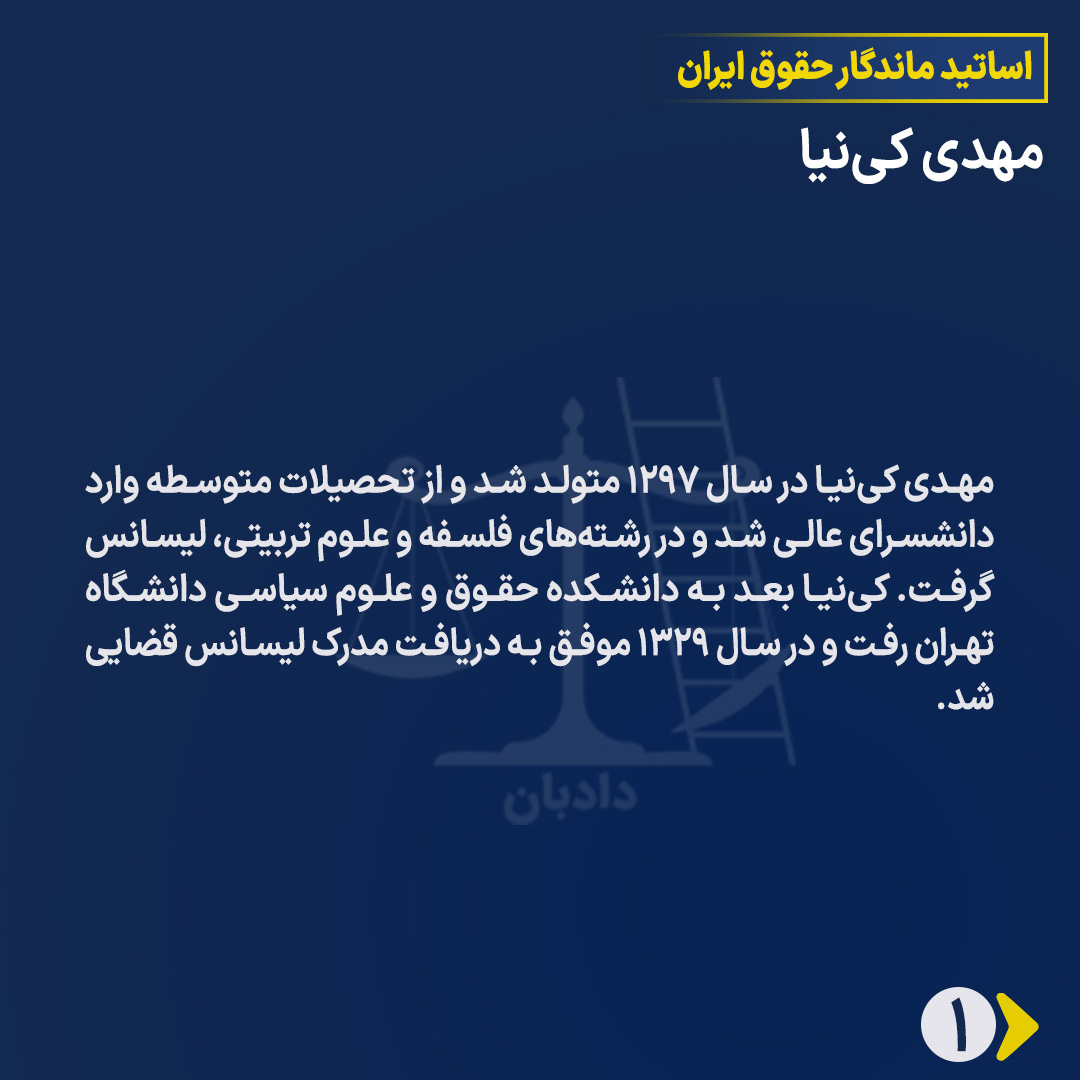مهدی کینیا در سال ۱۲۹۷ متولد شد و از تحصیلات متوسطه وارد دانشسرای عالی شد و در رشتههای فلسفه و علوم تربیتی، لیسانس گرفت. کینیا بعد به دانشکده حقوق و علوم سیاسی دانشگاه تهران رفت و در سال ۱۳۲۹ موفق به دریافت مدرک لیسانس قضایی شد.