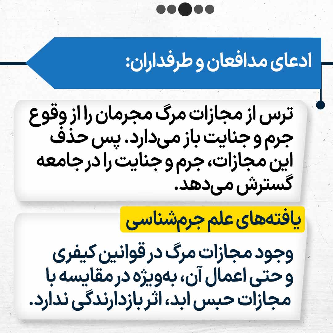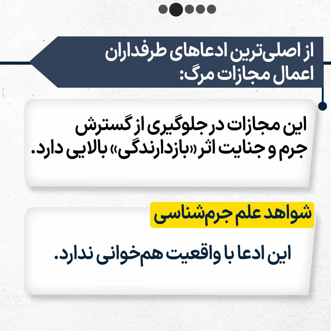 برخلاف این ادعا اما یافتههای جرمشناسی نشان میدهد وجود مجازات مرگ در قوانین کیفری و حتی اعمال آن – آنطور که ادعا میشود – بهویژه در مقایسه با مجازات حبس ابد، اثر بازدارندگی ندارد. بررسی آمار جرم و جنایت در کشورهایی که مجازات مرگ را از قوانین خود حذف کرده یا اعمال آن را متوقف کردهاند نیز به صراحت حکایت از این دارد که این کشورها برخلاف ادعای طرفداران مجازات مرگ، پس از حذف یا توقف اعمال این مجازات، با موج افزایش جرم و جنایت روبرو نشدهاند و نمودار جرم و جنایت در آنها تقریبا ثابت بوده است.