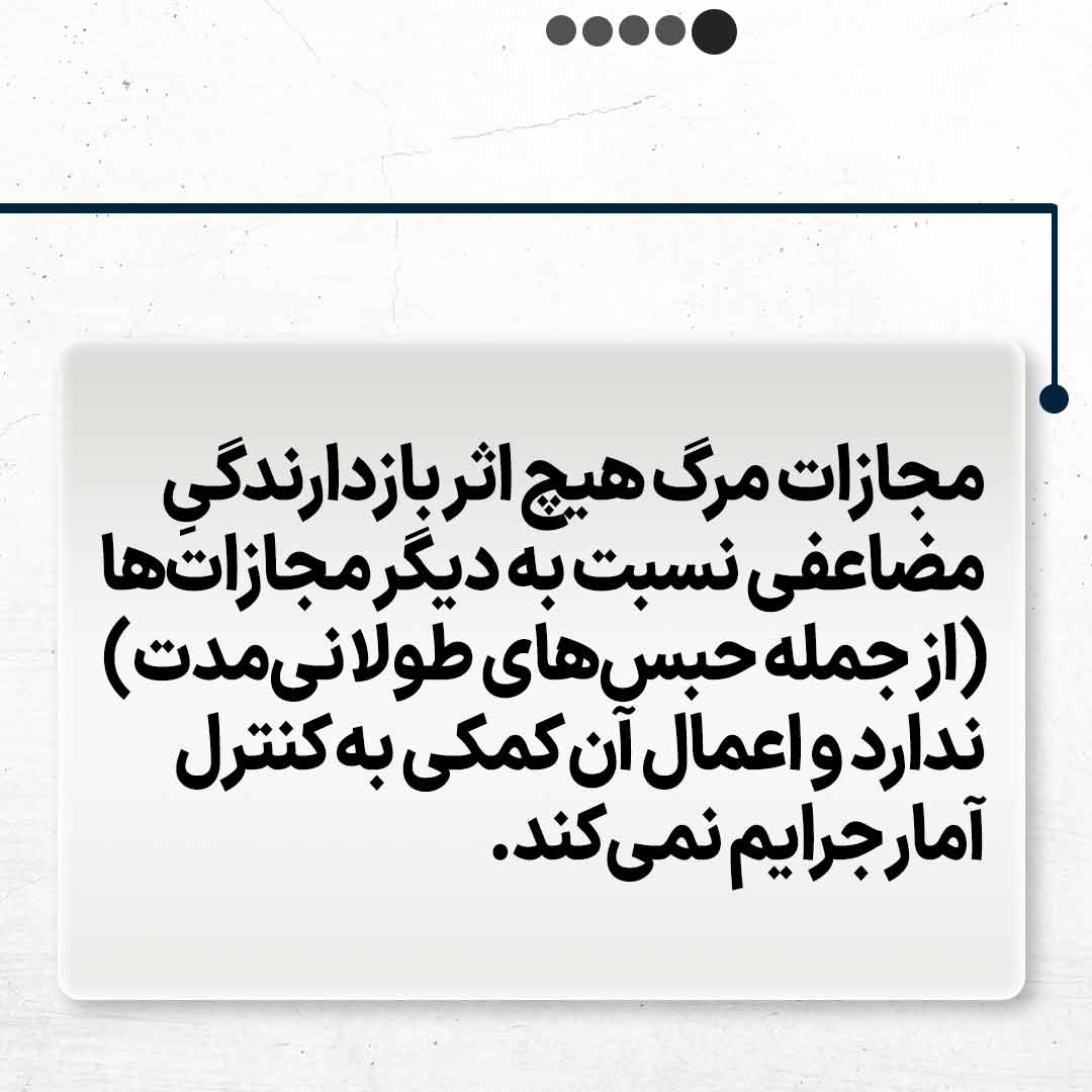 این عدم افزایش میزان جرم و جنایت خود به روشنی بیانگر این واقعیت است که مجازات مرگ هیچ اثر بازدارندگیِ مضاعفی نسبت به دیگر مجازاتها (از جمله حبسهای طولانیمدت) ندارد و اعمال آن کمکی به کنترل آمار جرایم نمیکند.