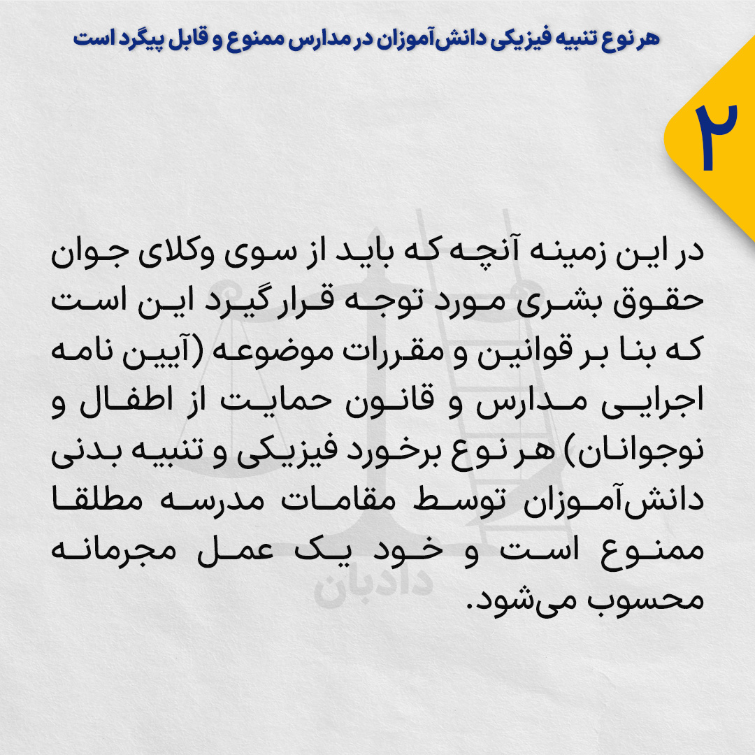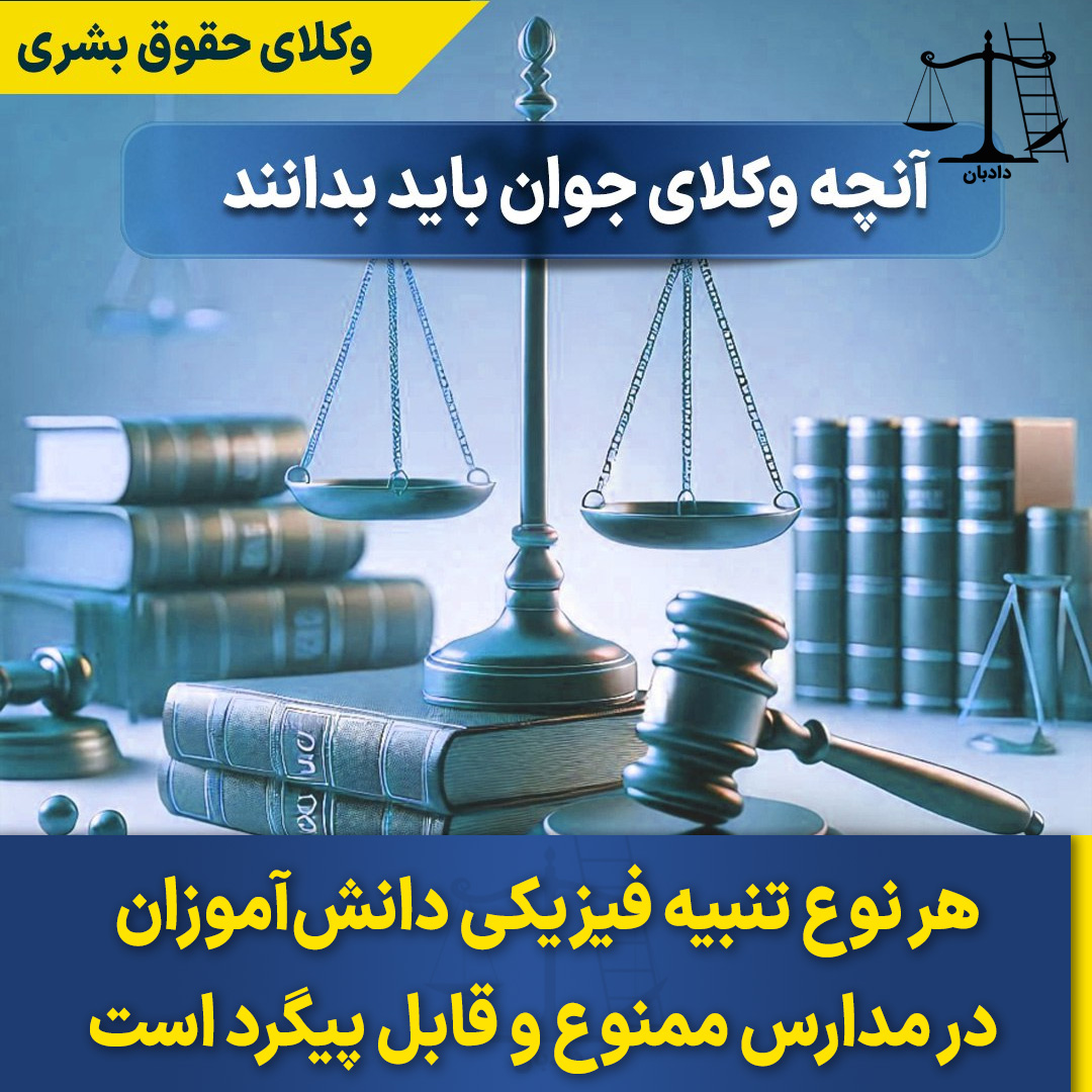 در این زمینه آنچه که باید از سوی وکلای جوان حقوق بشری مورد توجه قرار گیرد این است که بنا بر قوانین و مقررات موضوعه (آیین نامه اجرایی مدارس و قانون حمایت از اطفال و نوجوانان) هر نوع برخورد فیزیکی و تنبیه بدنی دانشآموزان توسط مقامات مدرسه مطلقا ممنوع است و خود یک عمل مجرمانه محسوب میشود.