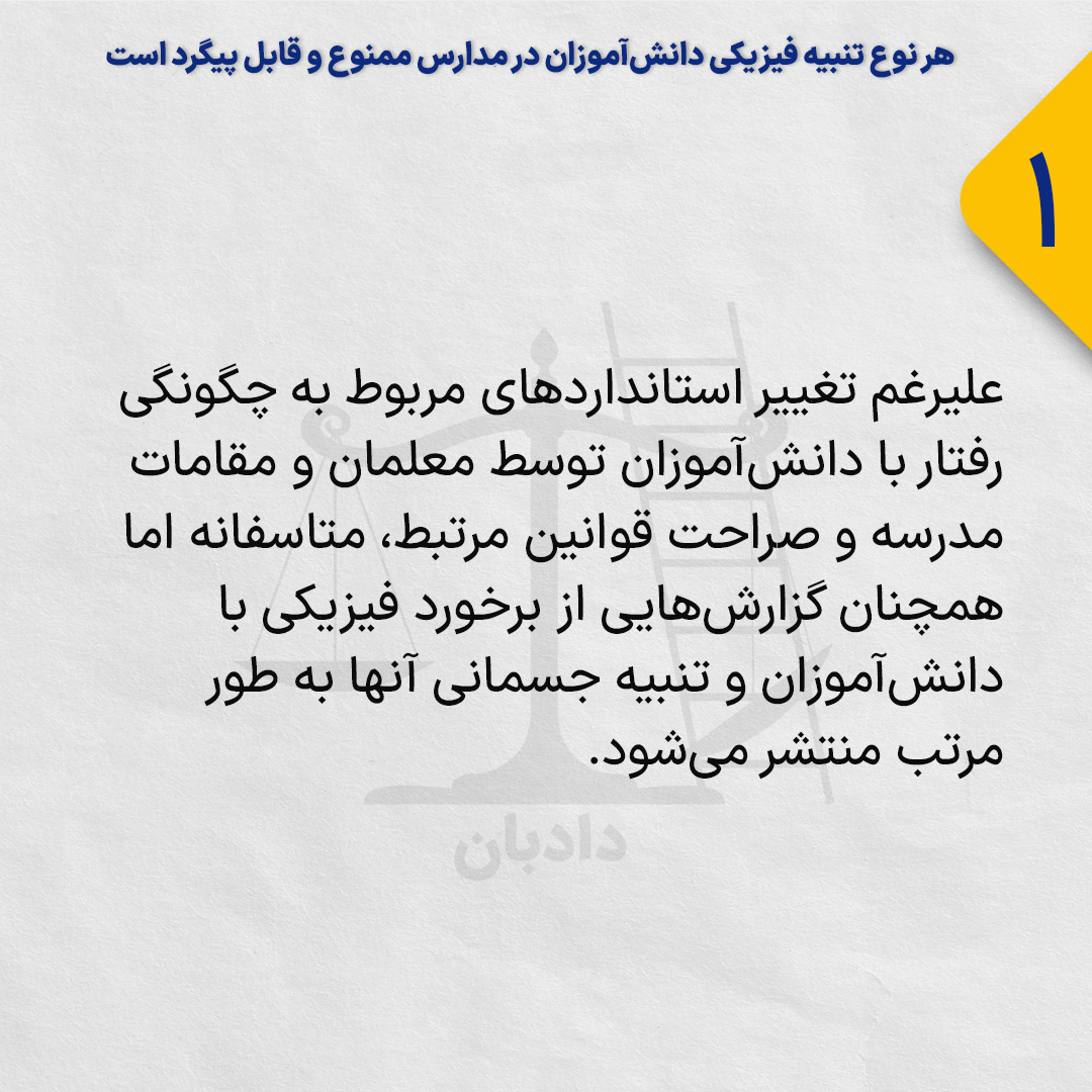 علیرغم تغییر استانداردهای مربوط به چگونگی رفتار با دانشآموزان توسط معلمان و مقامات مدرسه و صراحت قوانین مرتبط، متاسفانه اما همچنان گزارشهایی از برخورد فیزیکی با دانشآموزان و تنبیه جسمانی آنها به طور مرتب منتشر میشود.