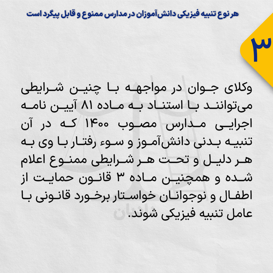 وکلای جوان در مواجهه با چنین شرایطی میتوانند با استناد به ماده ۸۱ آیین نامه اجرایی مدارس مصوب ۱۴۰۰ که در آن تنبیه بدنی دانشآموز و سوء رفتار با وی به هر دلیل و تحت هر شرایطی ممنوع اعلام شده و همچنین ماده ۳ قانون حمایت از اطفال و نوجوانان خواستار برخورد قانونی با عامل تنبیه فیزیکی شوند.