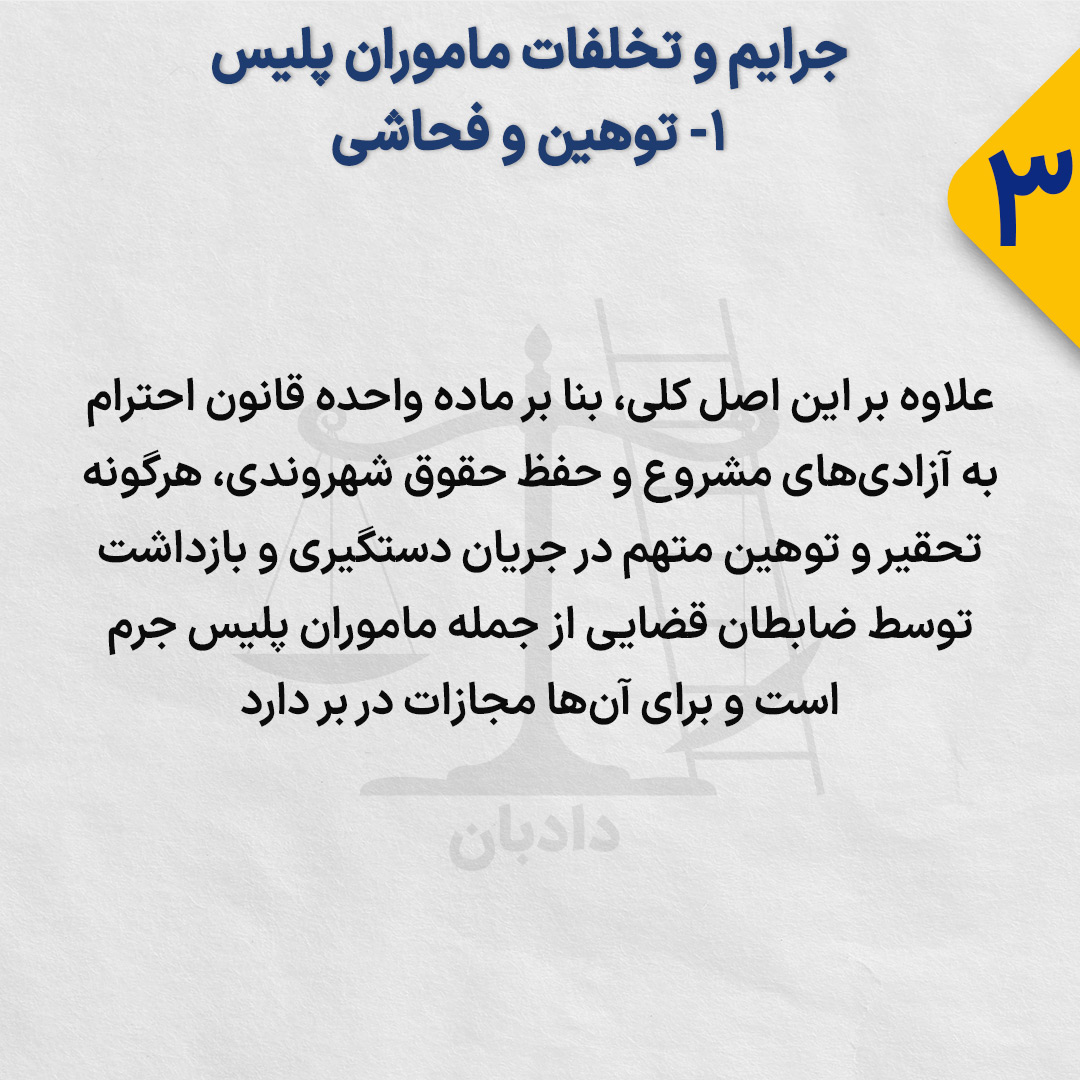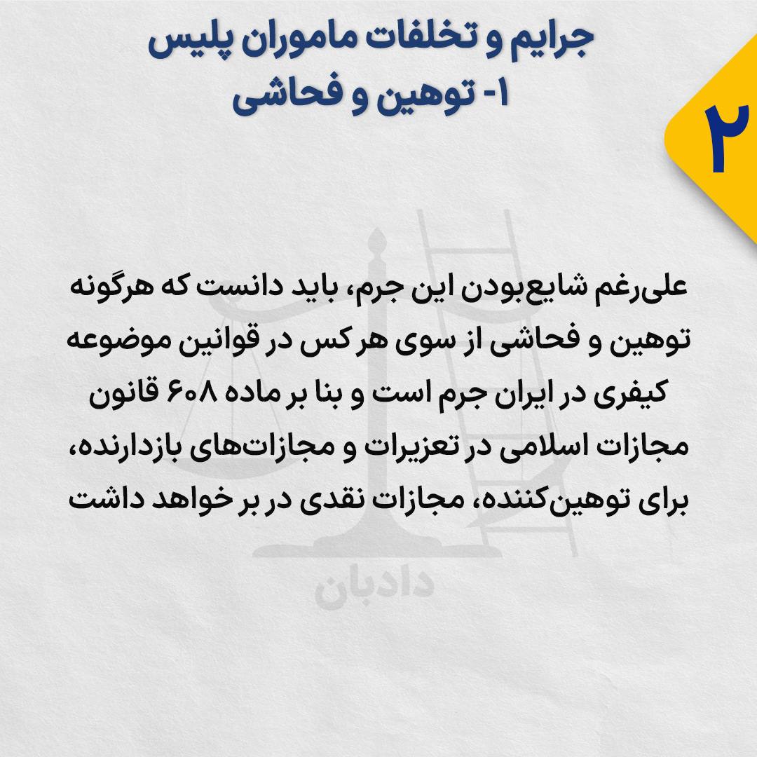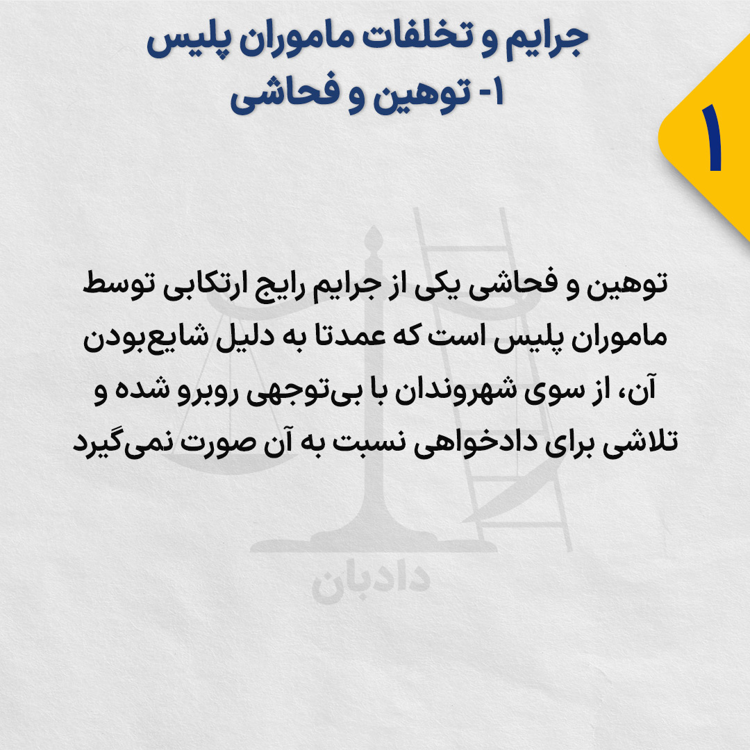 – توهین و فحاشی یکی از جرایم رایج ارتکابی توسط ماموران پلیس است که عمدتا به دلیل شایعبودن آن، از سوی شهروندان با بیتوجهی روبرو شده و تلاشی برای دادخواهی نسبت به آن صورت نمیگیرد.