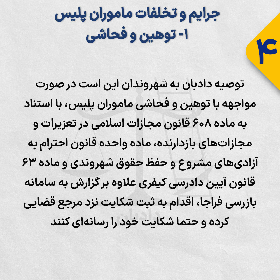 – توصیه دادبان به شهروندان این است در صورت مواجهه با توهین و فحاشی ماموران پلیس، با استناد به ماده ۶۰۸ قانون مجازات اسلامی در تعزیرات و مجازاتهای بازدارنده، ماده واحده قانون احترام به آزادیهای مشروع و حفظ حقوق شهروندی و ماده ۶۳ قانون آیین دادرسی کیفری علاوه بر گزارش به سامانه بازرسی فراجا، اقدام به ثبت شکایت نزد مرجع قضایی کرده و حتما شکایت خود را رسانهای کنند.