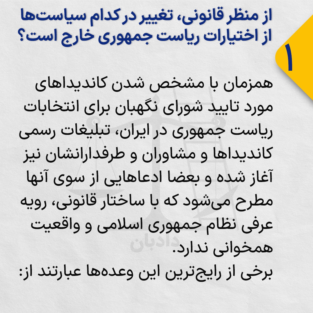 همزمان با مشخص شدن کاندیداهای مورد تایید شورای نگهبان برای انتخابات ریاست جمهوری در ایران، تبلیغات رسمی کاندیداها و مشاوران و طرفدارانشان نیز آغاز شده و بعضا ادعاهایی از سوی آنها مطرح میشود که با ساختار قانونی، رویه عرفی نظام جمهوری اسلامی و واقعیت همخوانی ندارد.