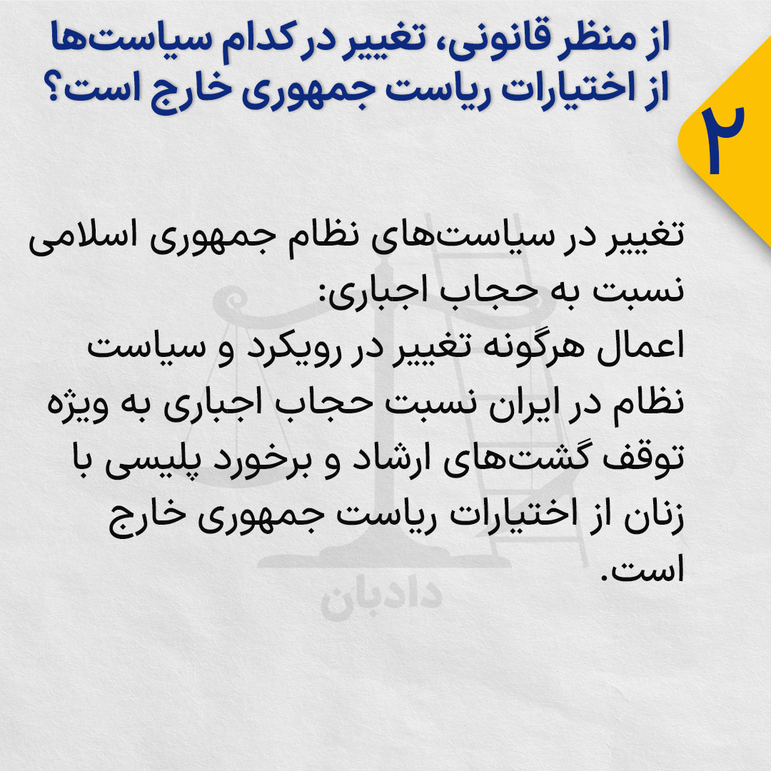 اعمال هرگونه تغییر در رویکرد و سیاست نظام در ایران نسبت حجاب اجباری به ویژه توقف گشتهای ارشاد و برخورد پلیسی با زنان از اختیارات ریاست جمهوری خارج است.